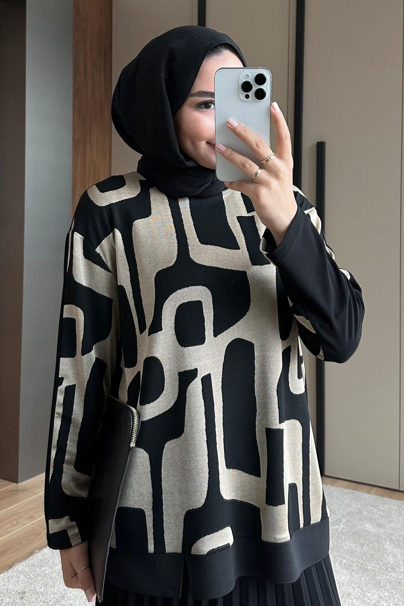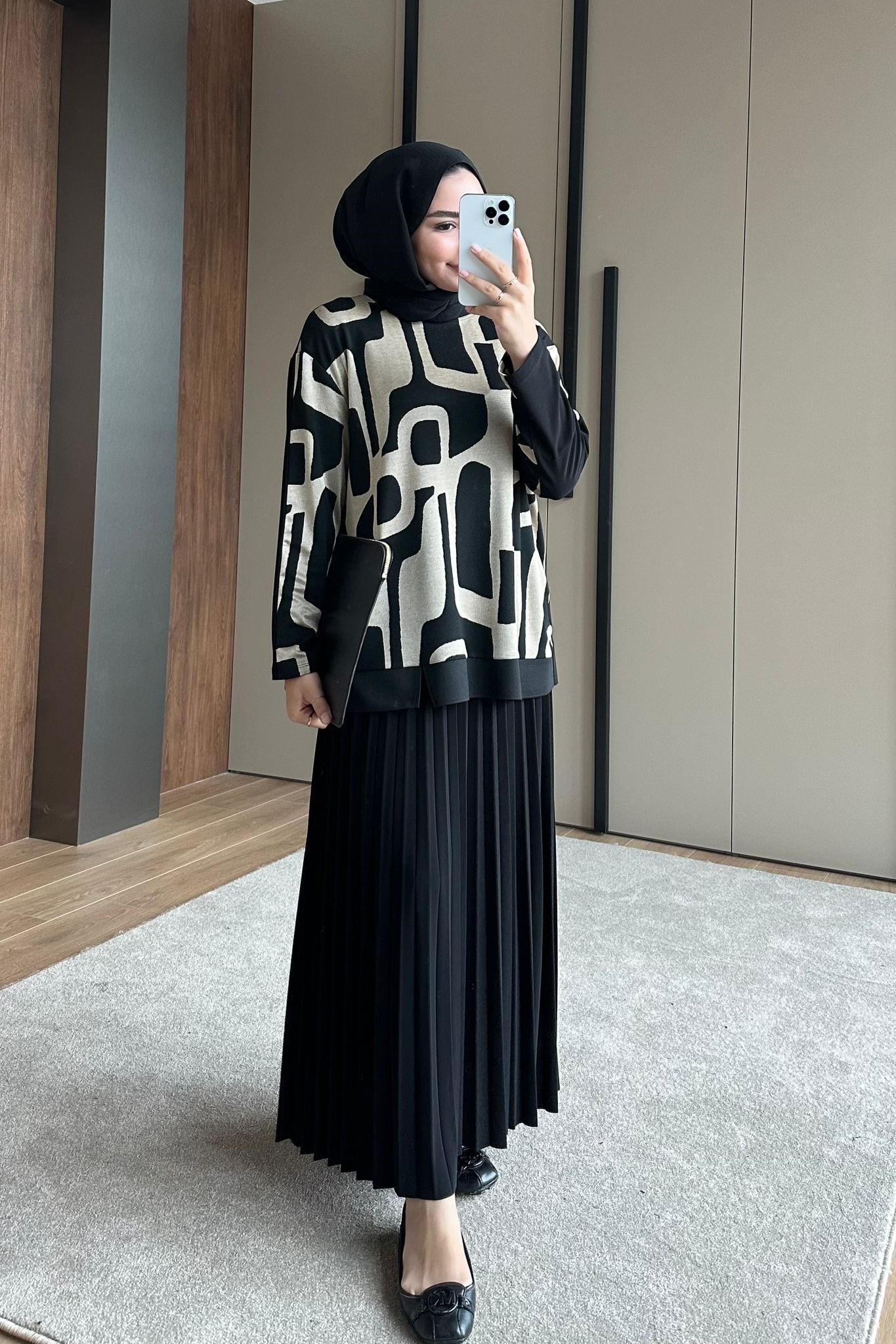 Ahi 11130 Geometrik Desenli Etekli Takım - Siyah - Bej