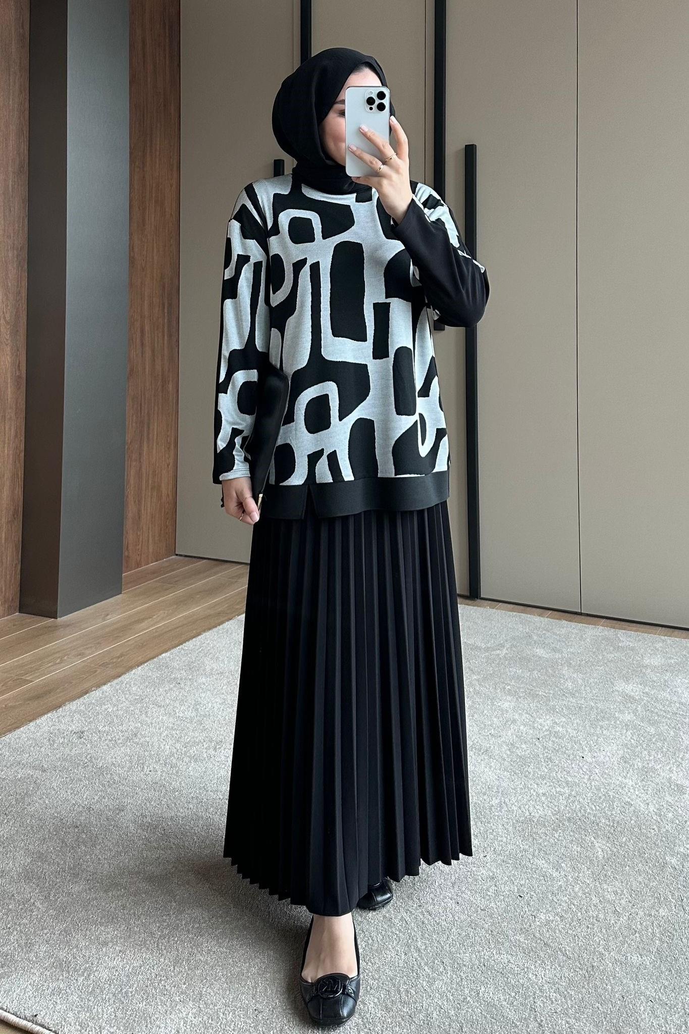 Ahi 11130 Geometrik Desenli Etekli Takım - Siyah - Bej