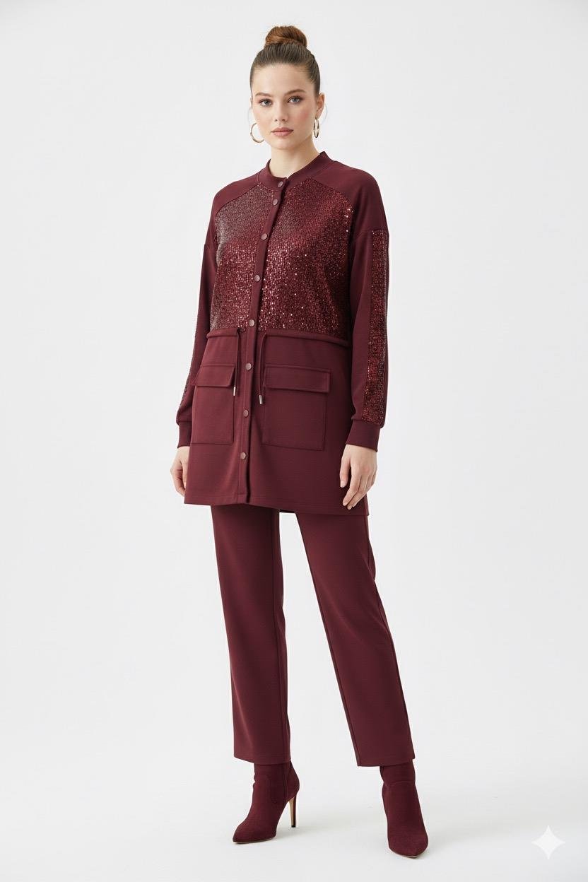 Ahi 11143 Payet Detay Pantolonlu Takım - Bordo (350197909)