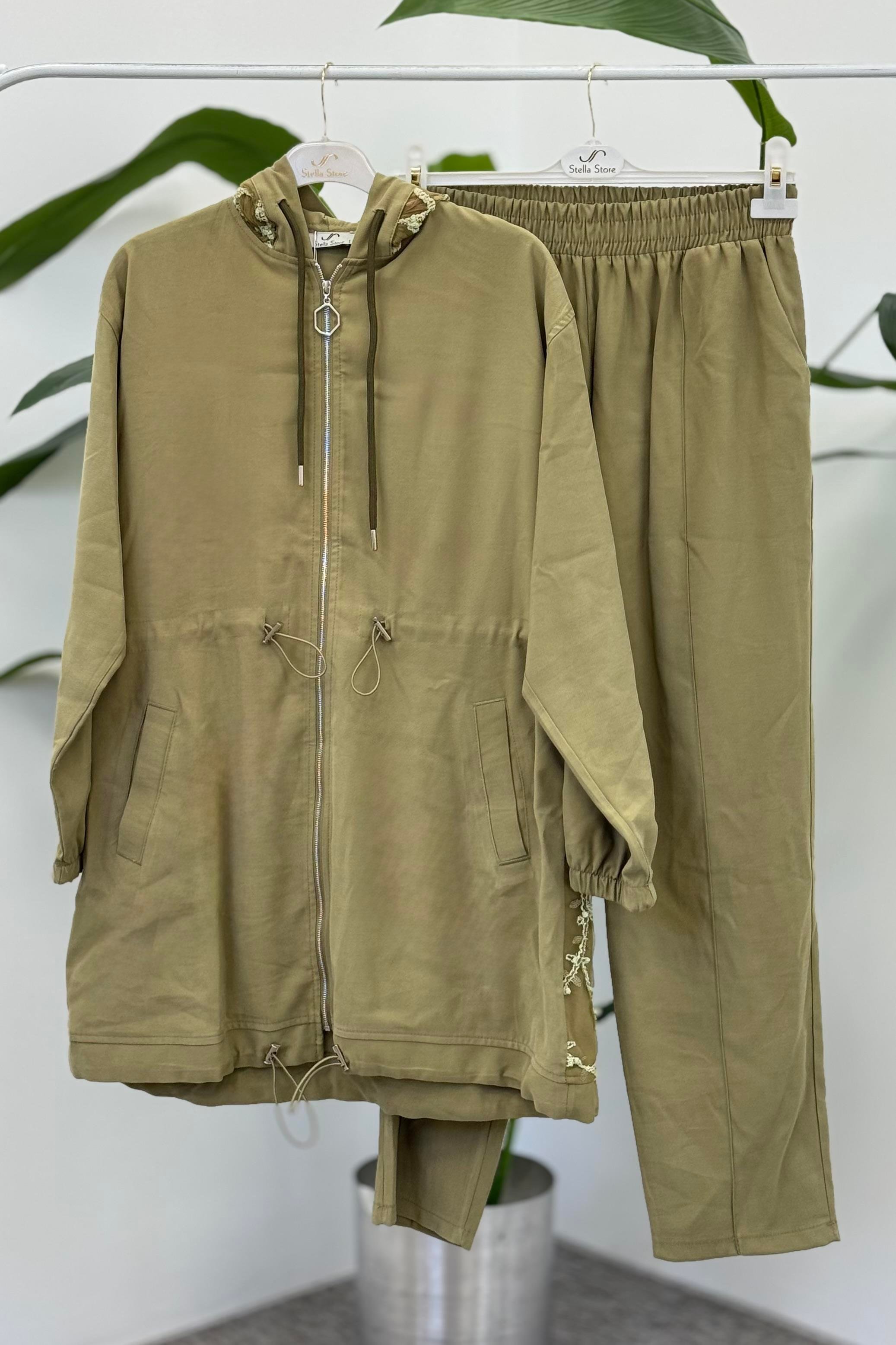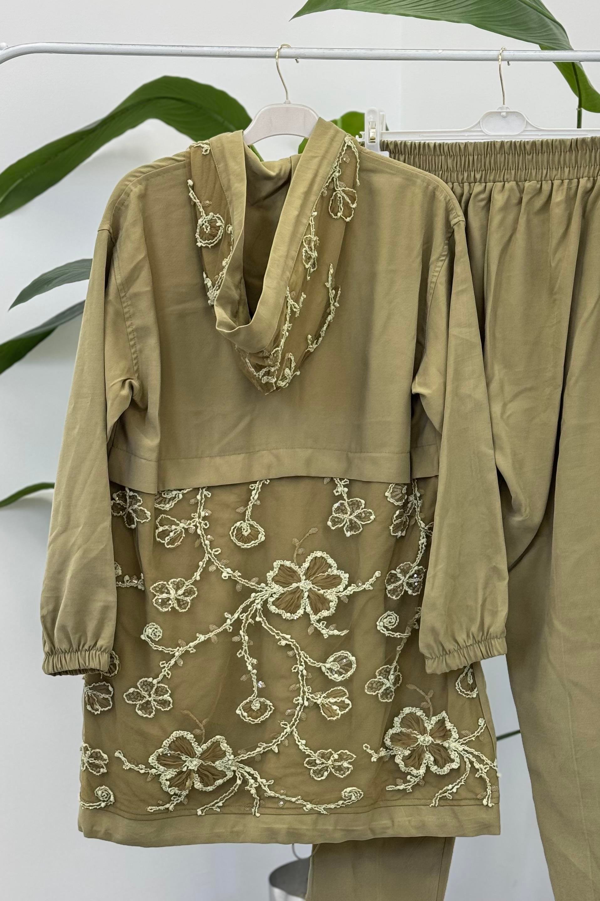 Arka Çiçek Nakış İşlemeli Pantolonlu Takım 1372 - Haki