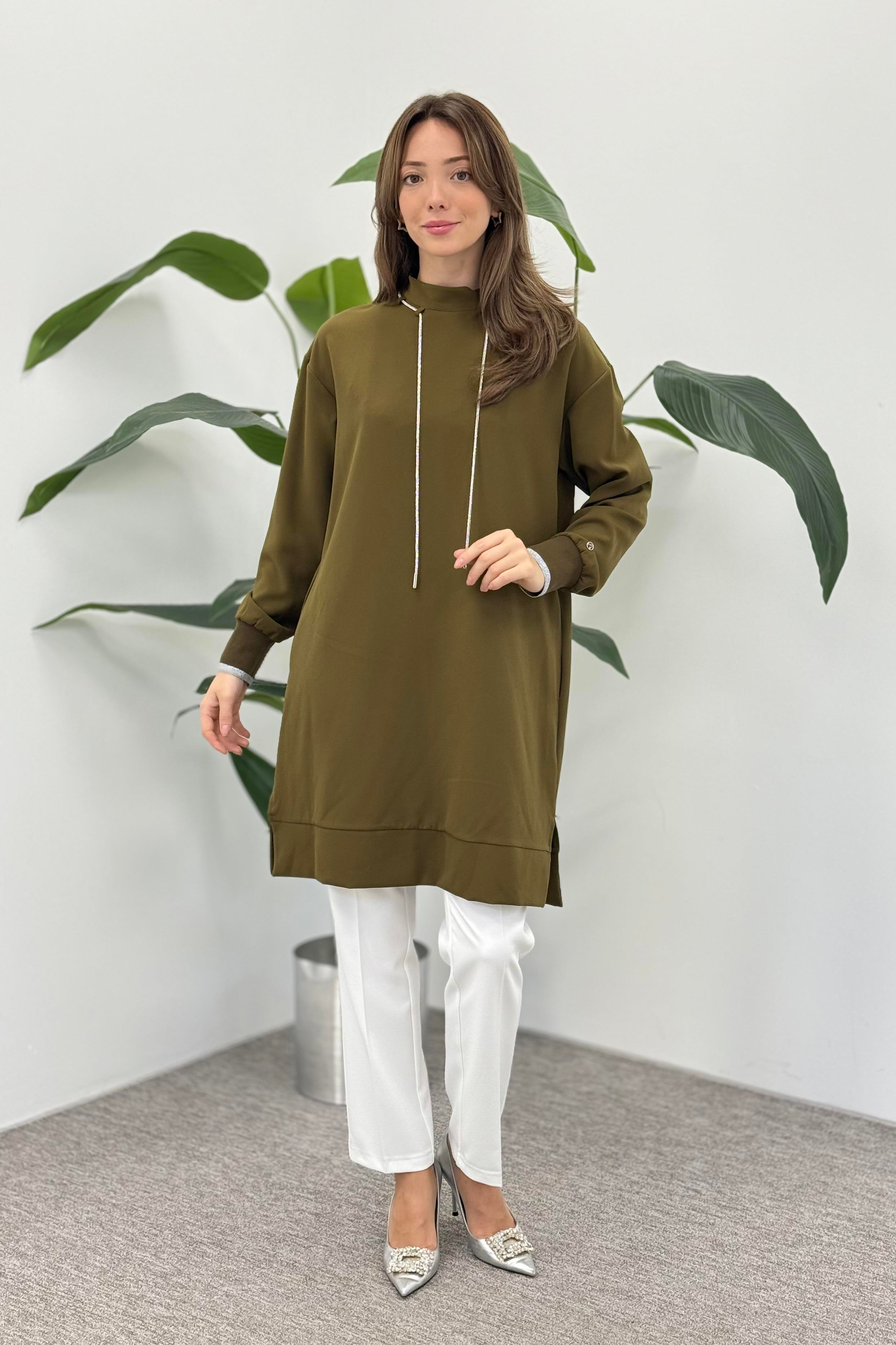 Armine Trend 25KT436 Yaka İp Detay Tunik - Yağ Yeşili