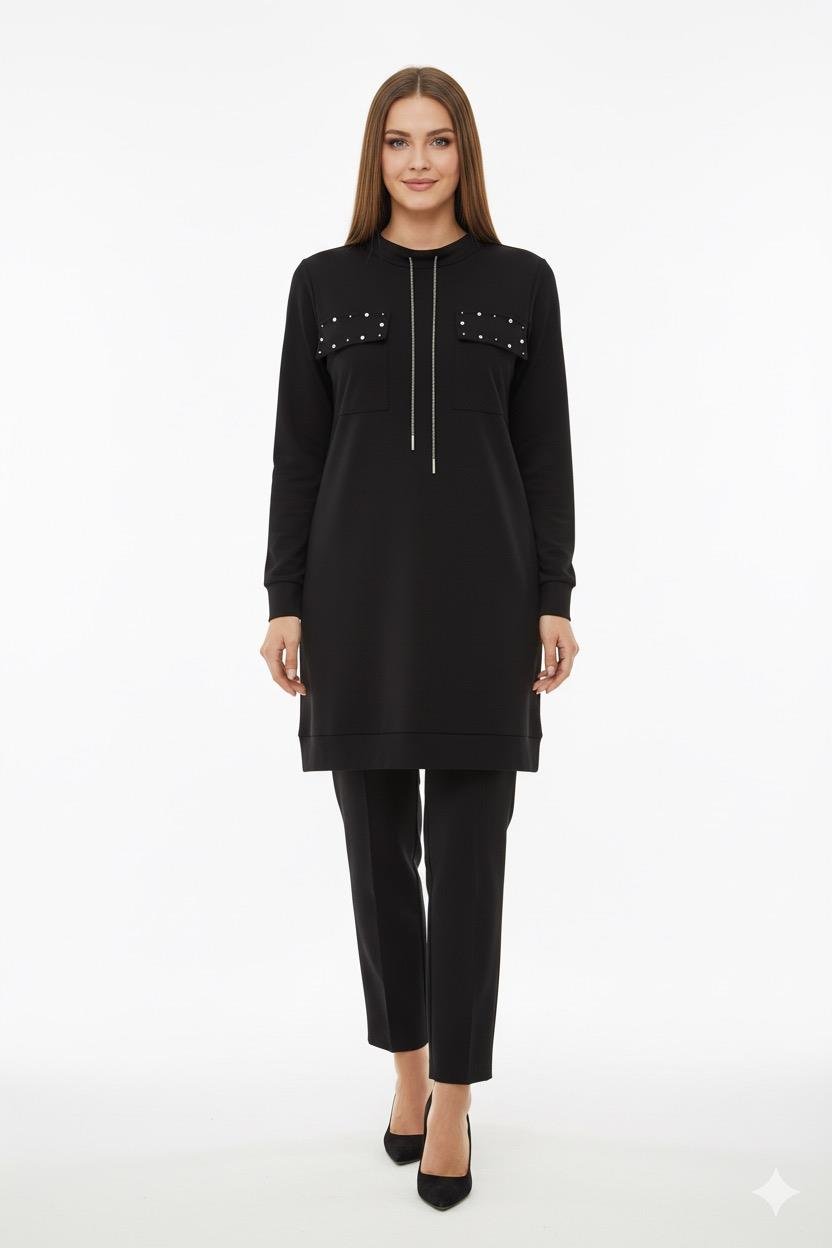 Armine Trend 25KT451 Cep Kapağı Taş İşlemeli Tunik - Siyah