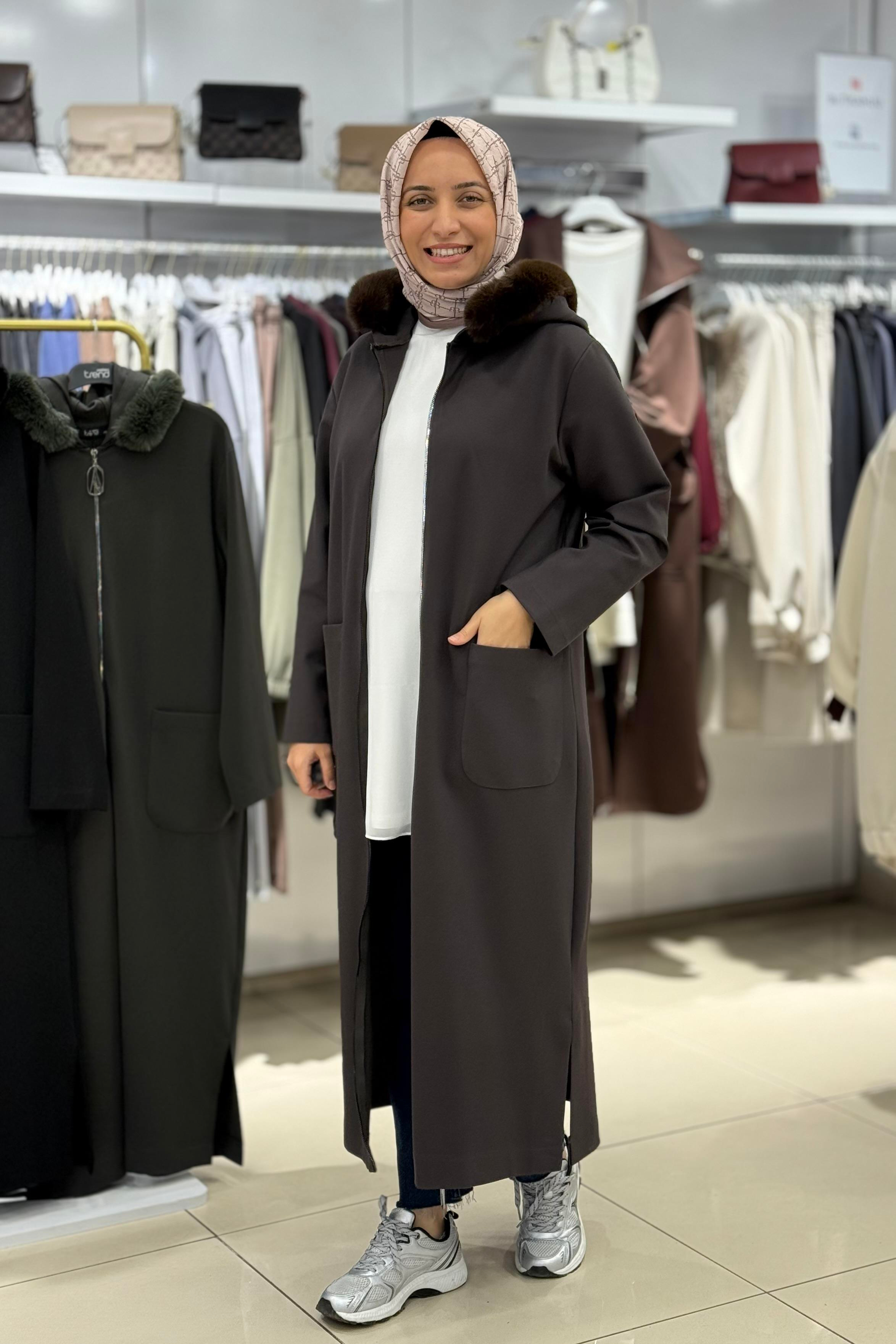 Armine Trend 25KT528 Kapişon Kürk Detay Kap - Kahverengi