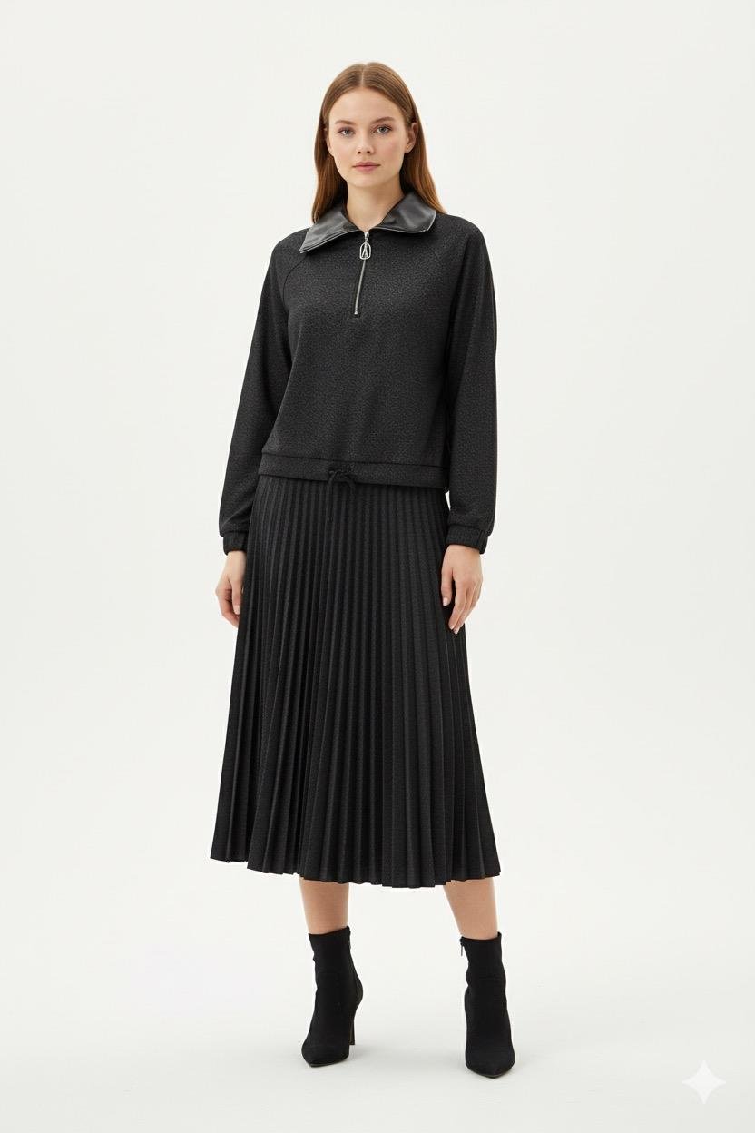 Armine Trend 25KT6102 Yaka Deri Detay Etekli Takım - Siyah (350344928)
