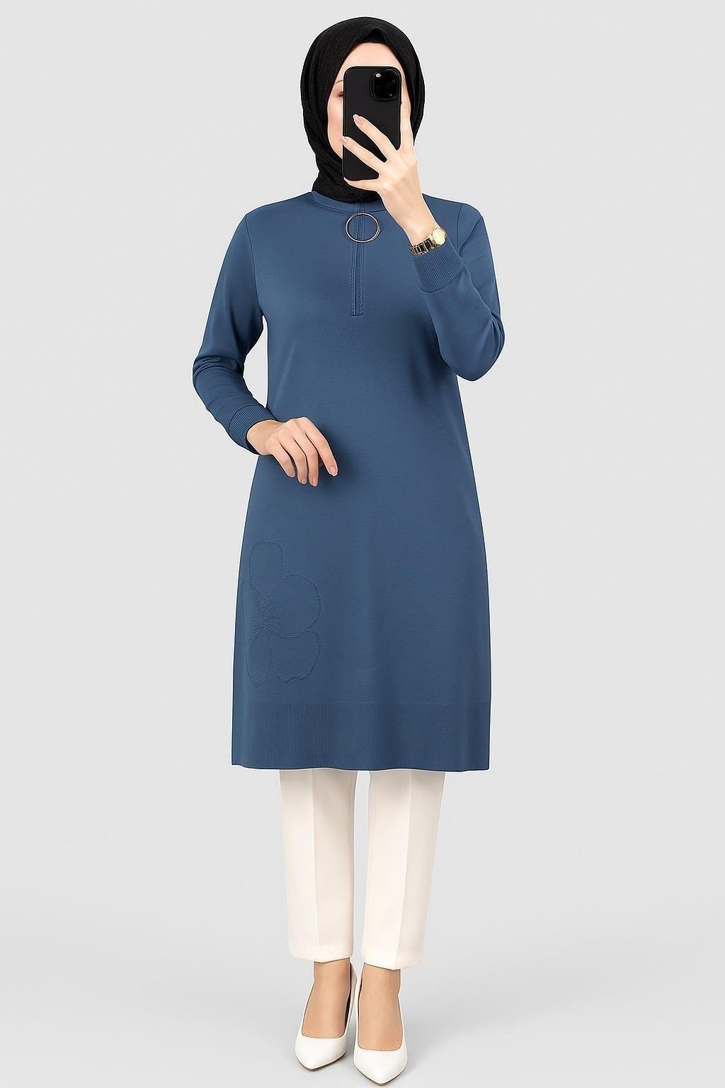 Armine Trend 25YTD4111 Omuz Desenli Yarım Fermuarlı Tunik - İndigo