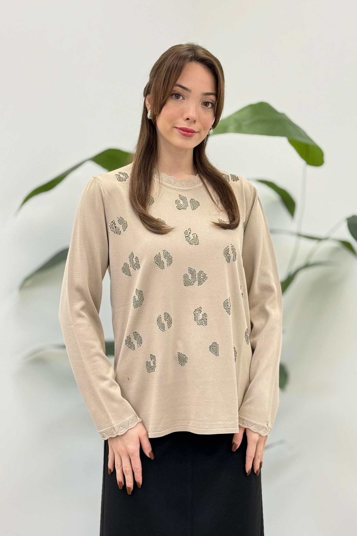 Armine Trend 25YTD4129 Yakası Dantelli Taş Baskılı Kazak - Koyu Taş