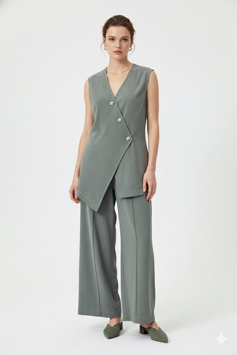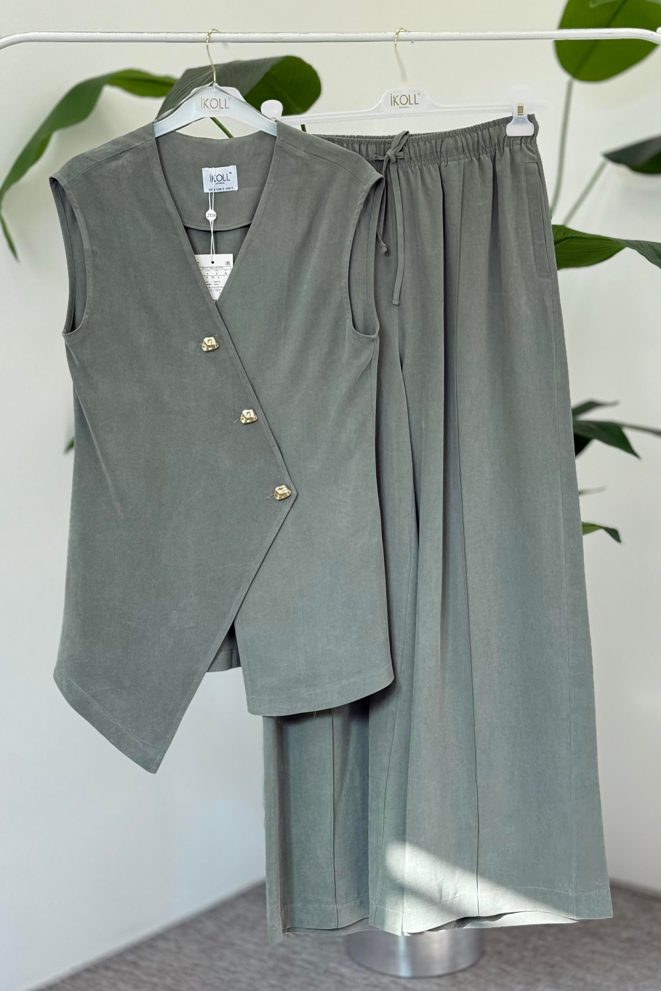 Asimetrik Gold Düğmeli Yelekli Takım 0035176 - Haki