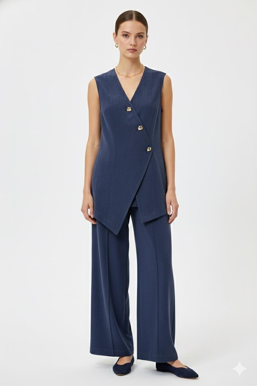 Asimetrik Gold Düğmeli Yelekli Takım 0035176 - Lacivert
