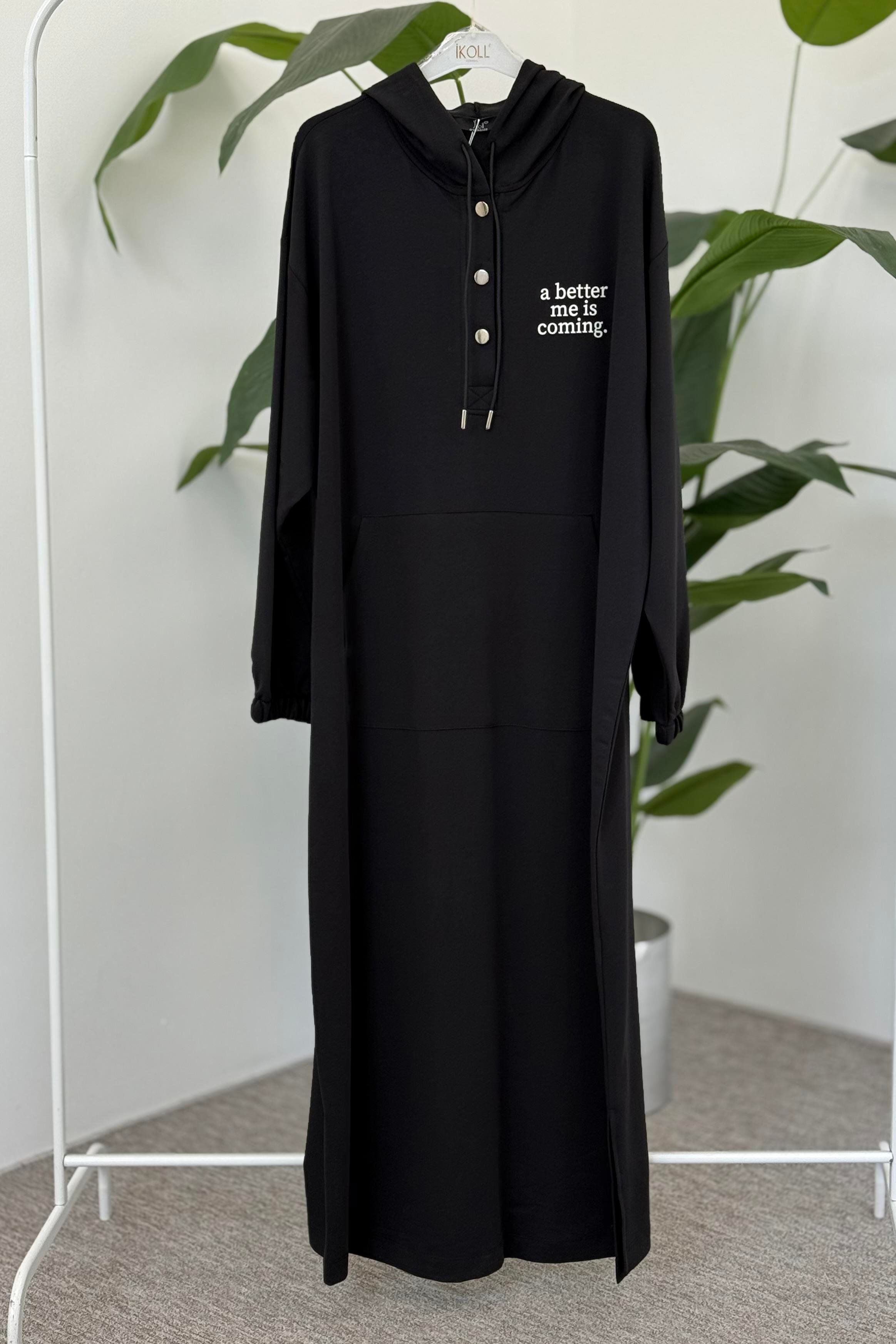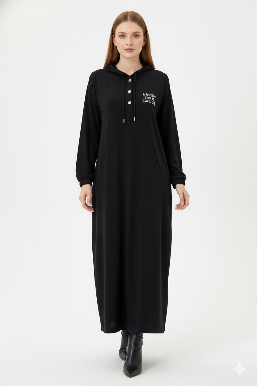 Baskılı Kapüşonlu ve Cepli Elbise 0033744 - Siyah (363132900)