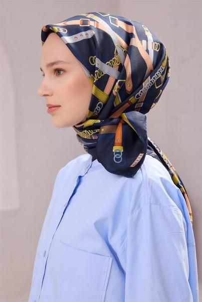 Belli Saf İpek Eşarp 4200D (T) - Lacivert - Turuncu