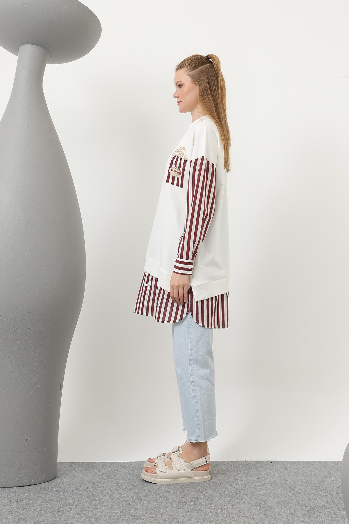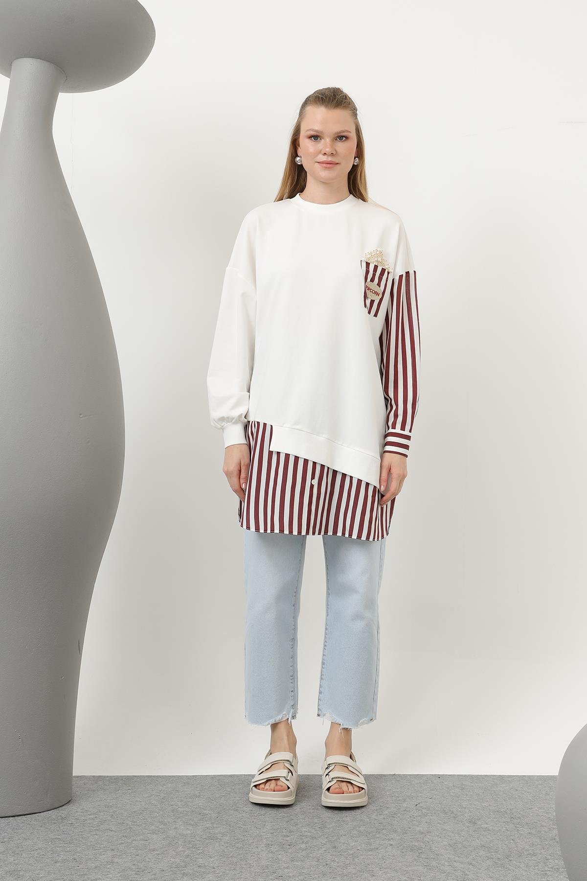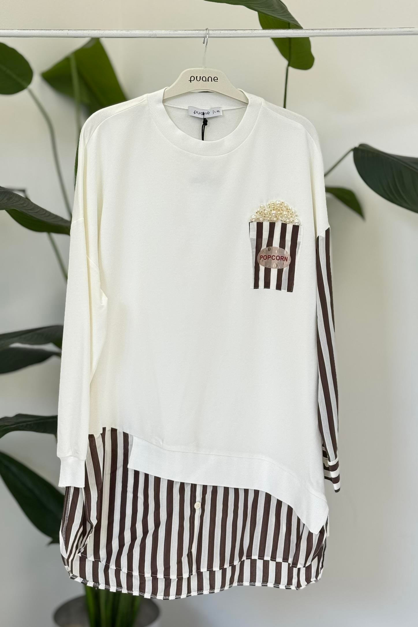 Cebi Popcorn Baskılı Çizgili Tunik 10651 - Browni
