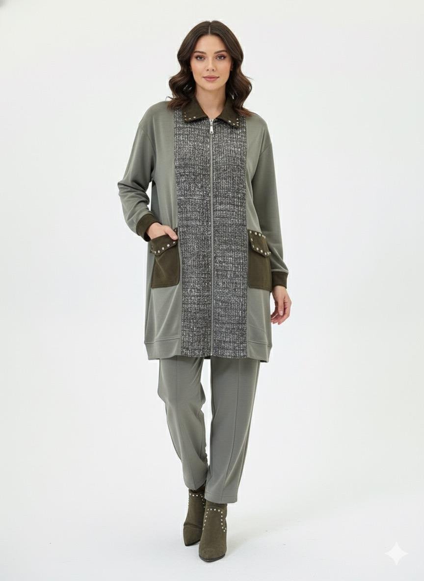 Cep ve Yaka Zımba Detay Pantolonlu Takım 1411 - Haki