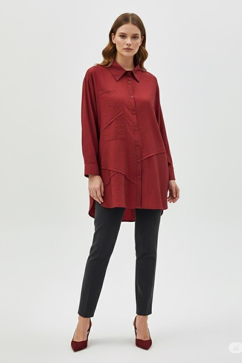 Ceremony 6148 Önden Düğmeli Uzun Cep Detaylı Tunik - Kırmızı (362144902)