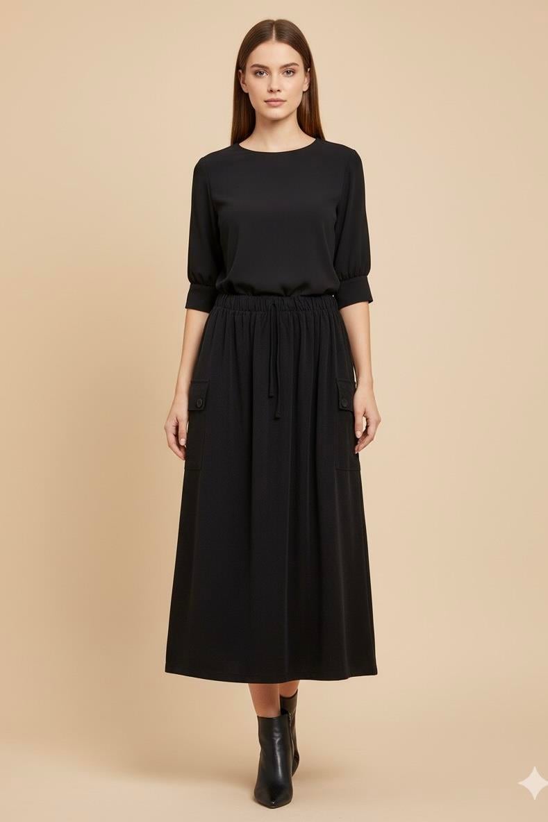 Ceremony 6606 Beli Lastikli İki Tarafı Cep Detaylı Etek - Siyah