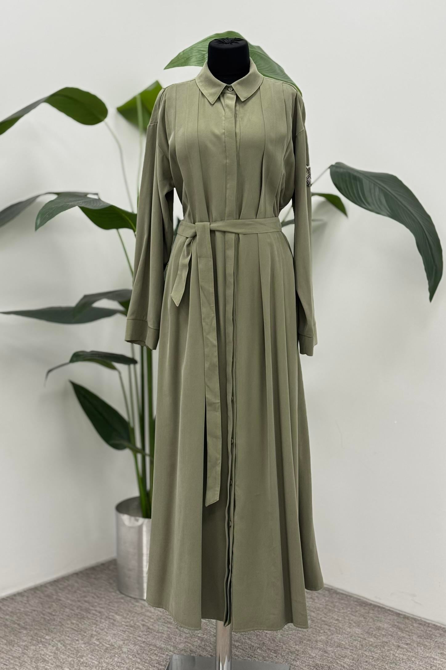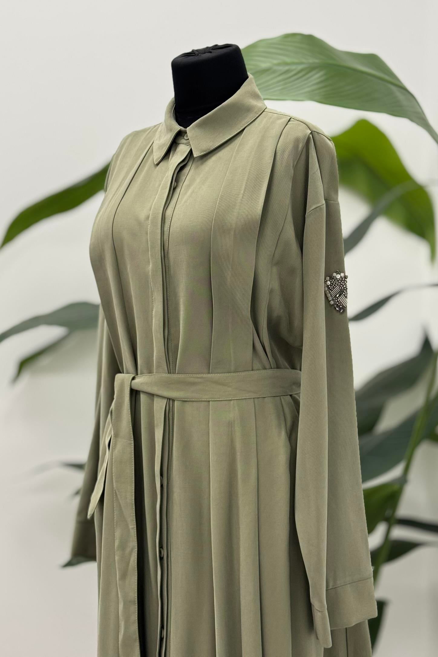Ceremony 6717 Kolu Taş Detay Önden Düğmeli Gömlek Elbise - Haki