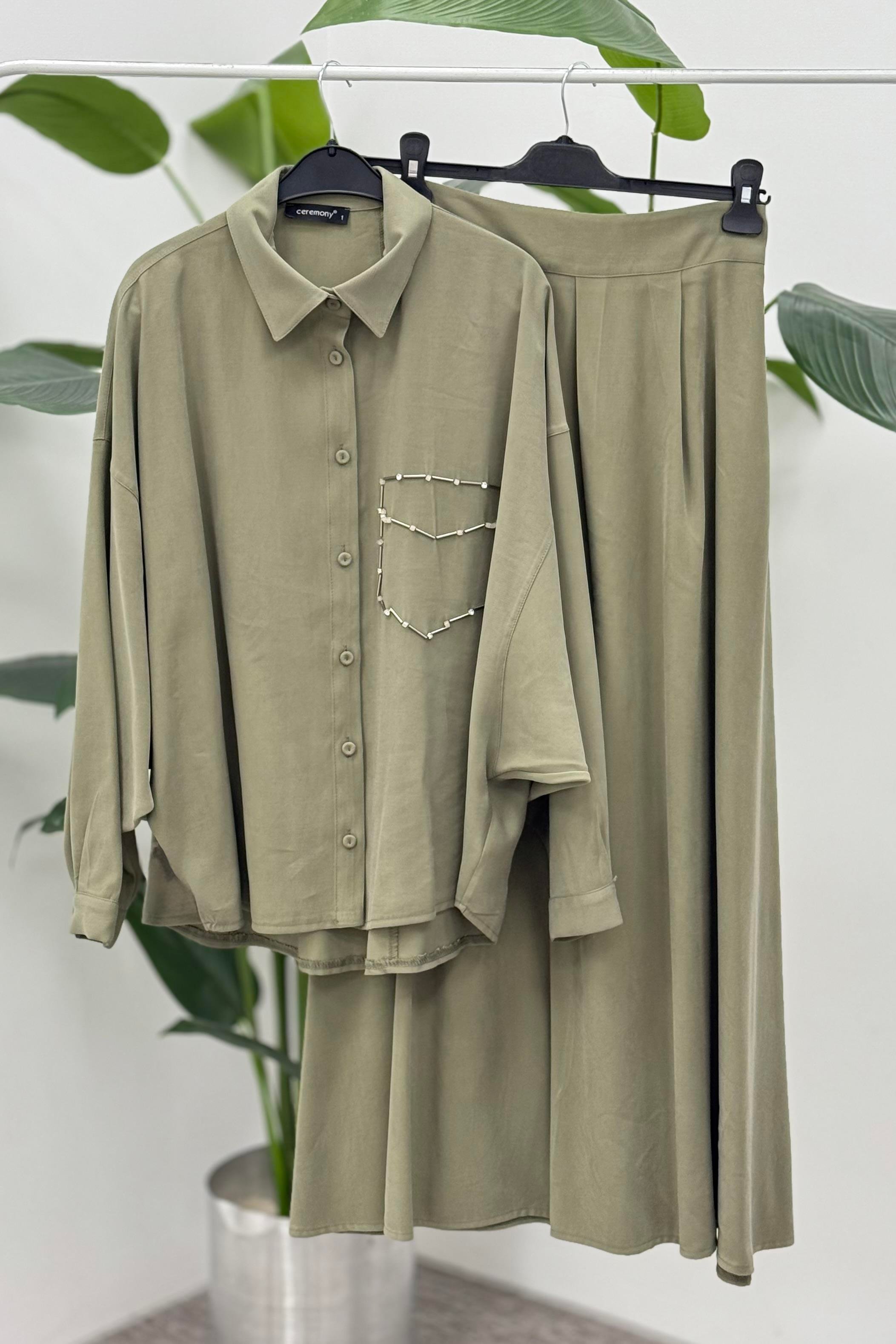 Ceremony 6945 Tuniği Boncuk İşlemeli Etekli Takım - Haki