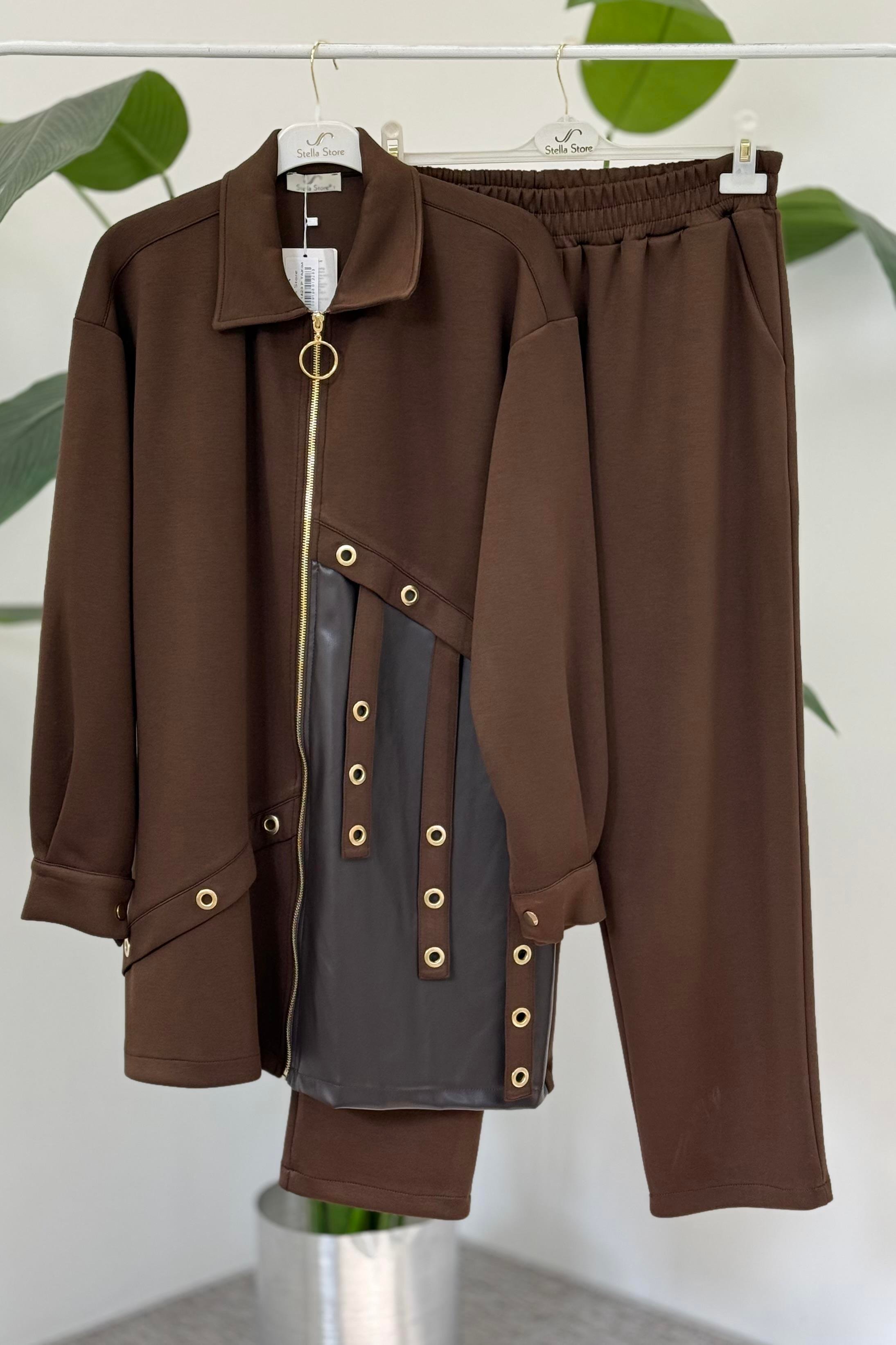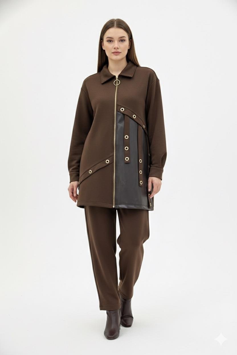 Deri ve Kuş Gözü Detay Pantolonlu Takım 1423 - Kahve (350307927)