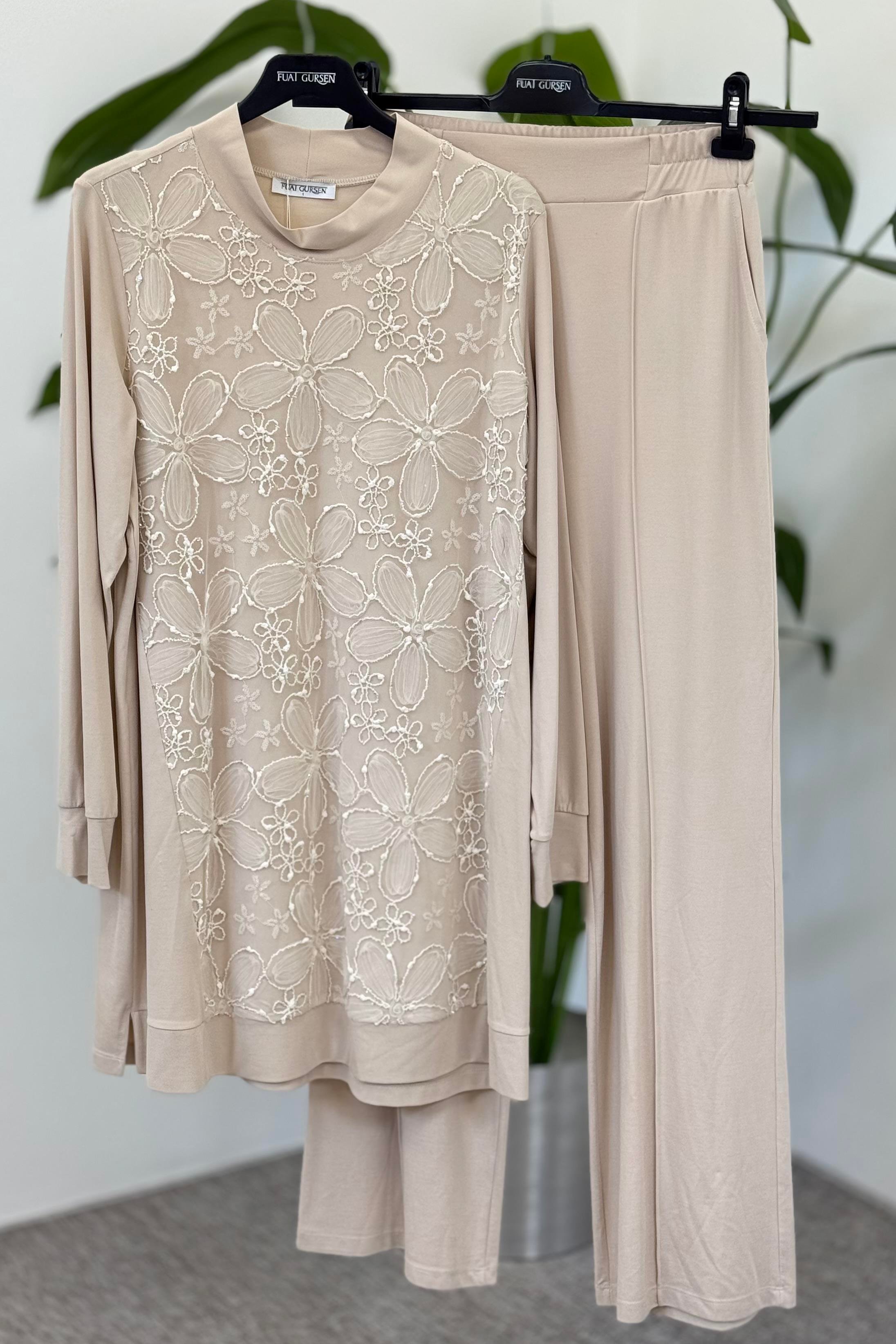 Fuat Gürşen 3372 Büyük B. Ön Çiçek Garnili Pantolonlu Takım - Bej