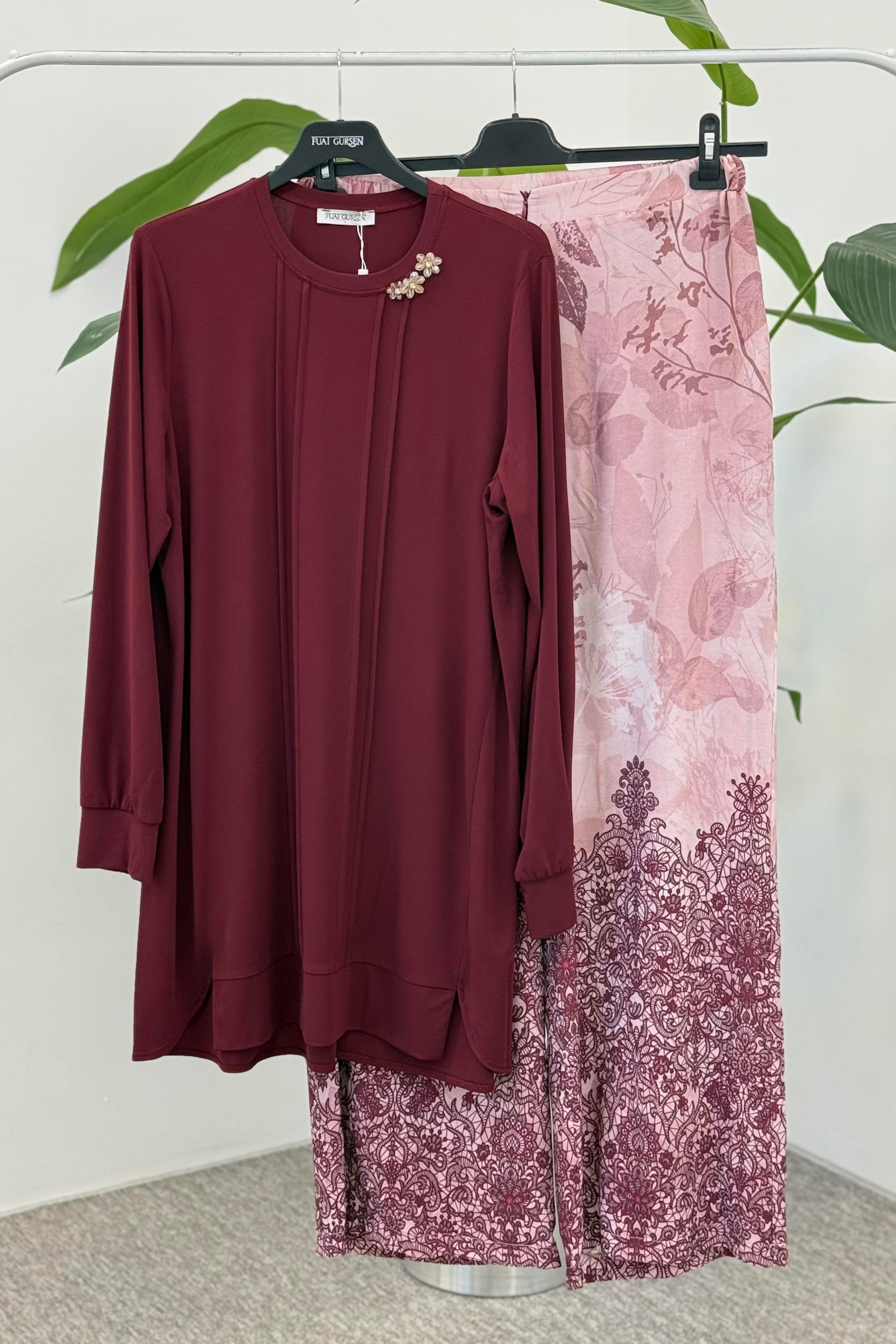 Fuat Gürşen 3377-1 Çiçek Desen Pantolonlu Takım - Bordo (350310815)
