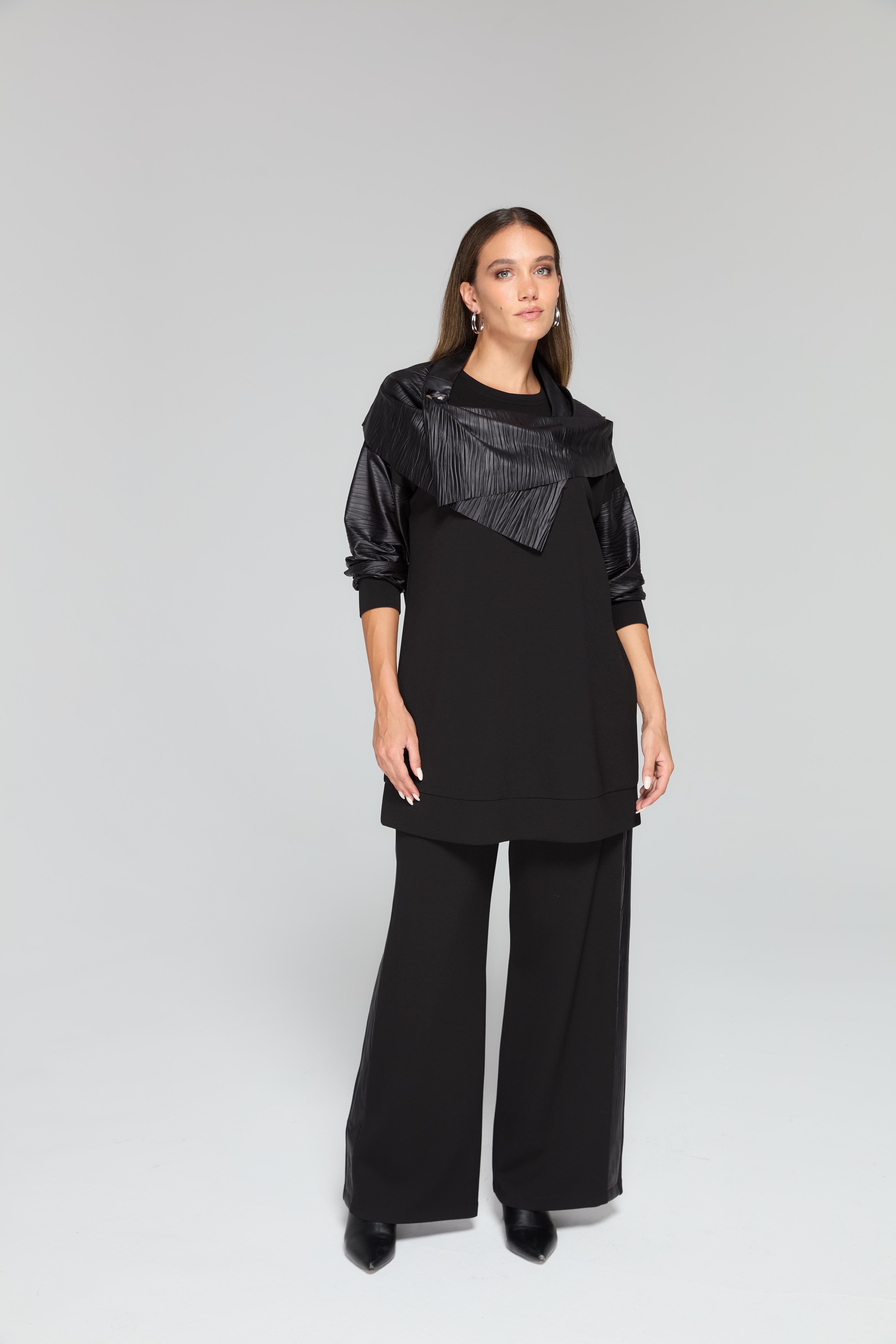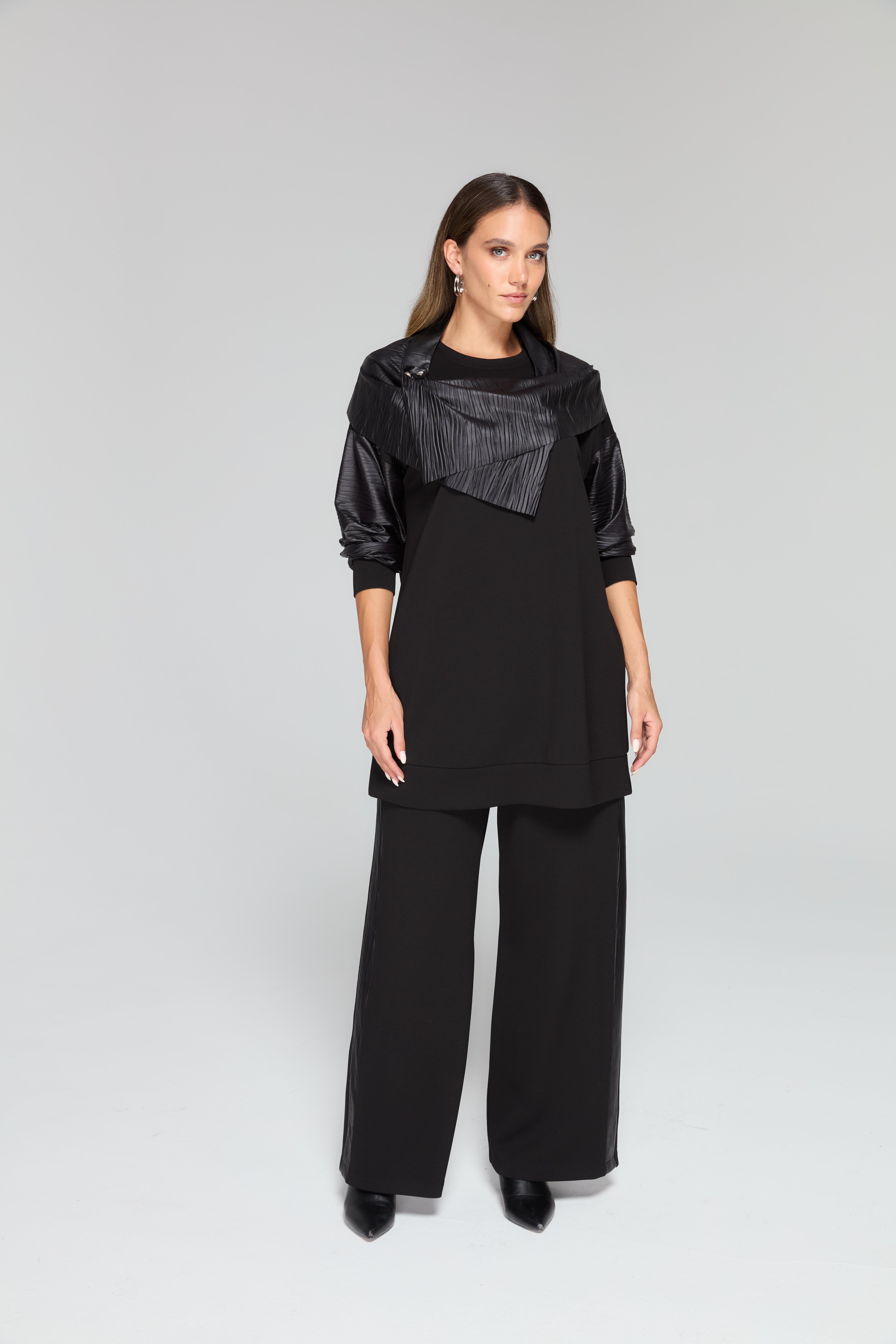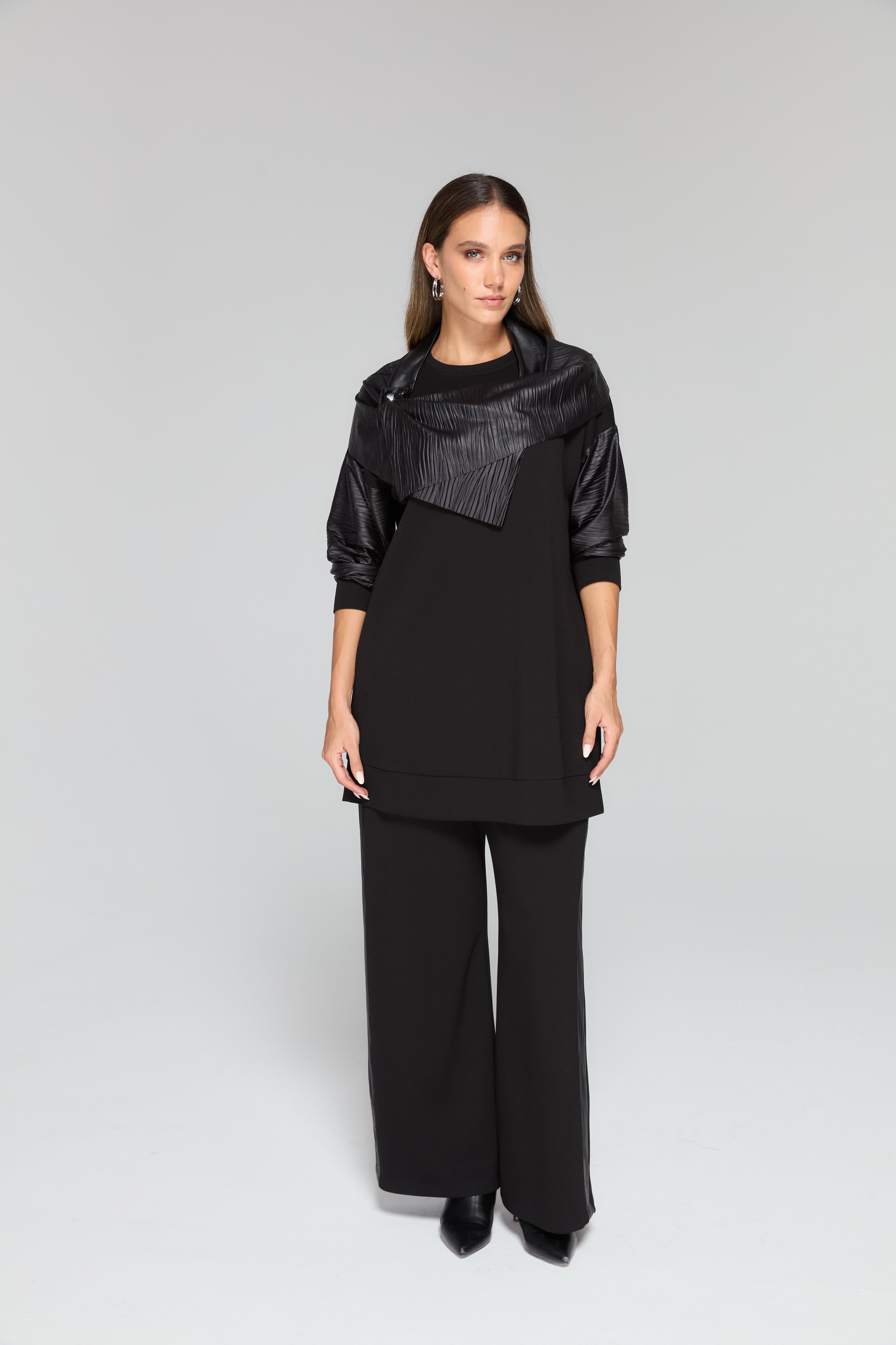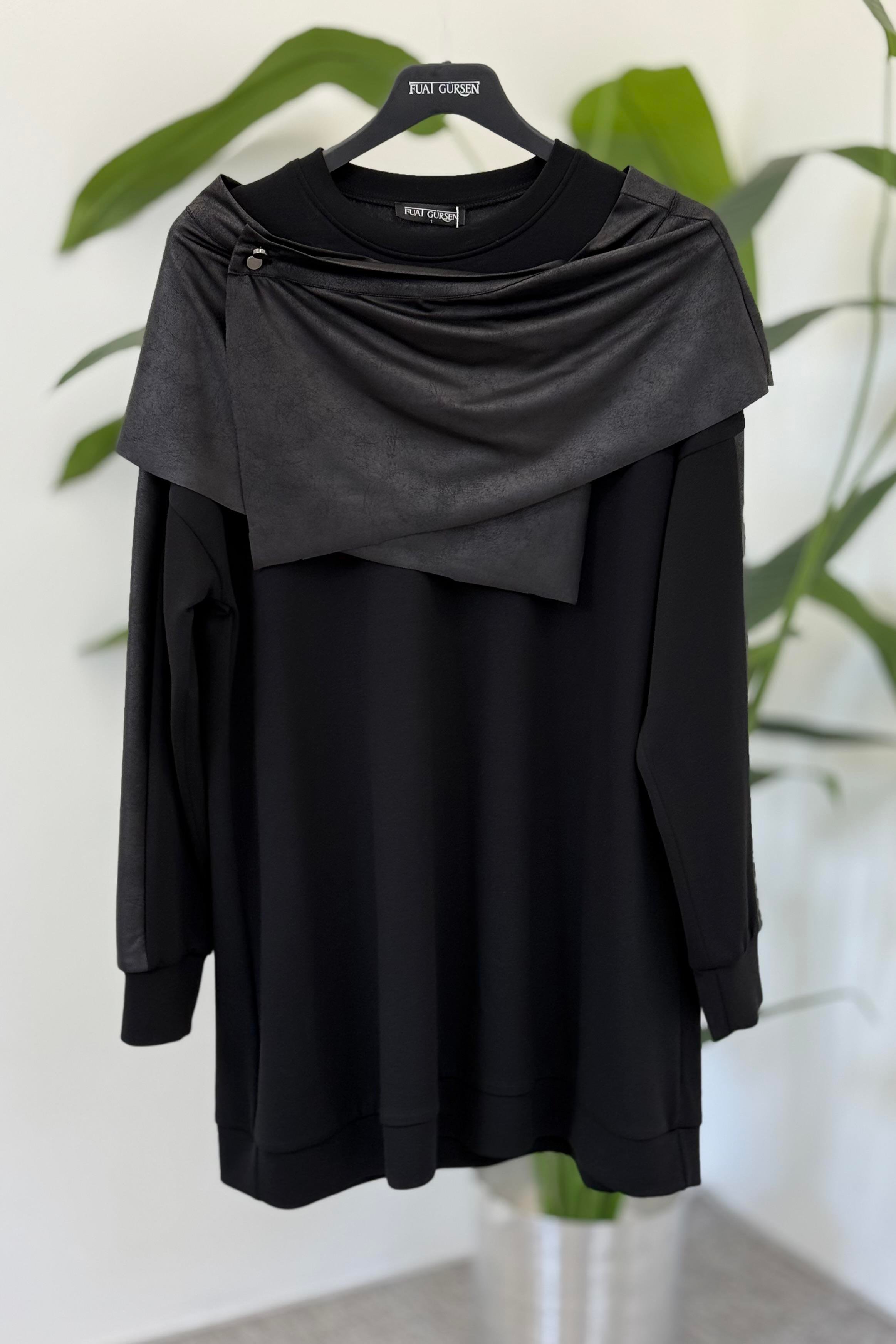 Fuat Gürşen 4304 Büyük B. Deri Garnili Yaka Detaylı Tunik - Siyah