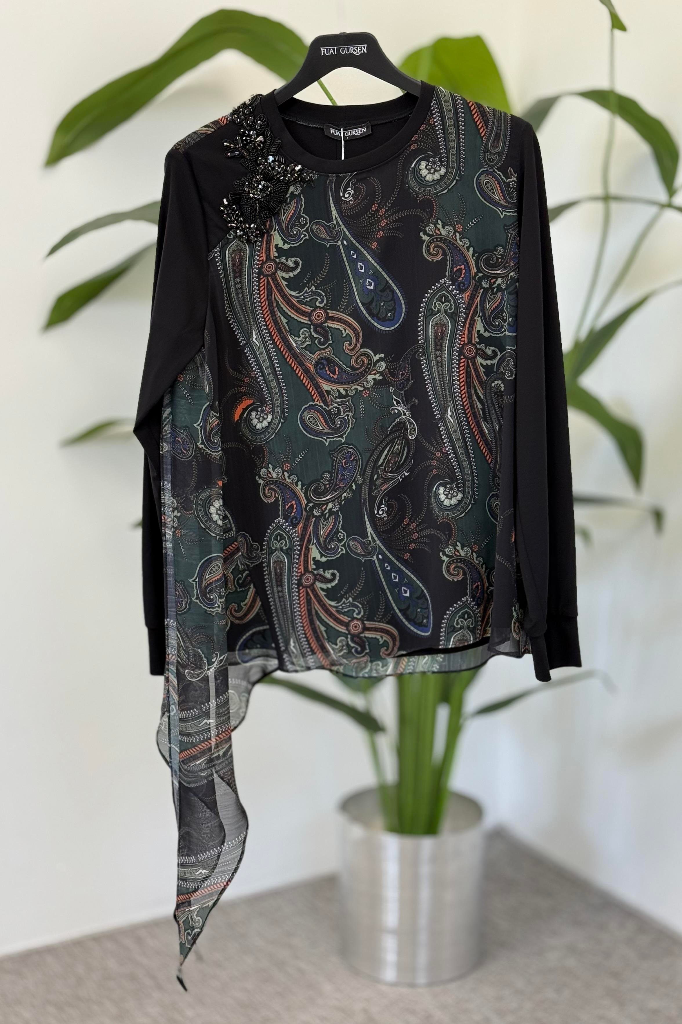 Fuat Gürşen 4307 Yan Başlama Detay Yaka Boncuklu Bluz - Siyah