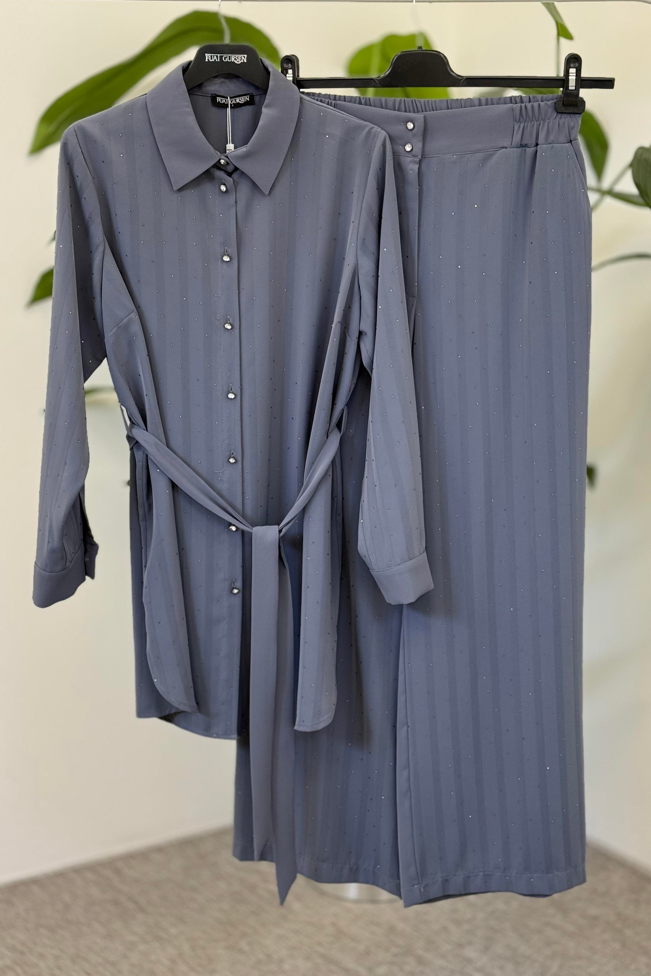 Fuat Gürşen 4310 Büyük B. Çizgili Taş Detaylı Pant. Takım - Gri