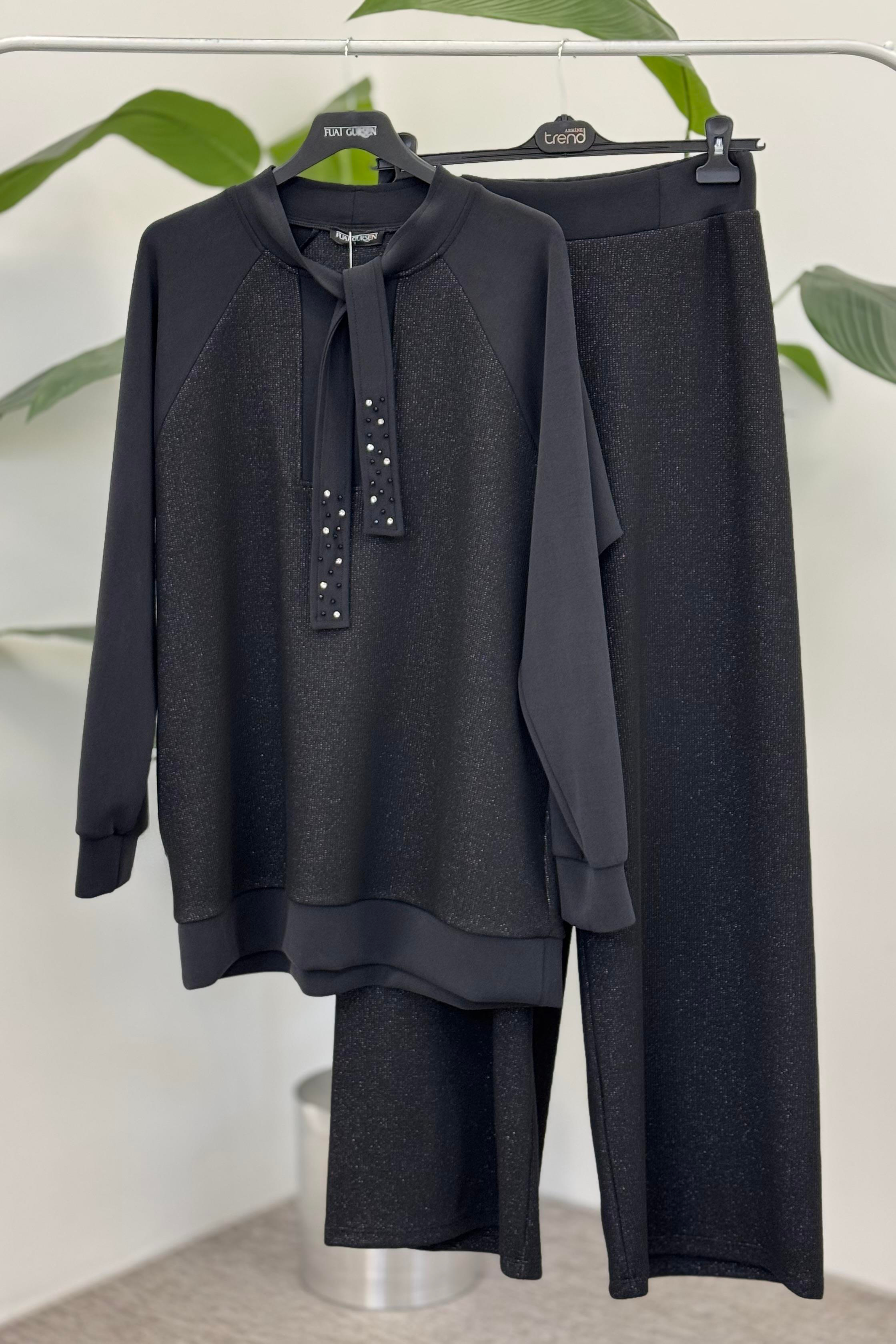 Fuat Gürşen 4323 Büyük B Yaka İpi Taş Detay Pantolonlu Takım - Siyah (350310913)