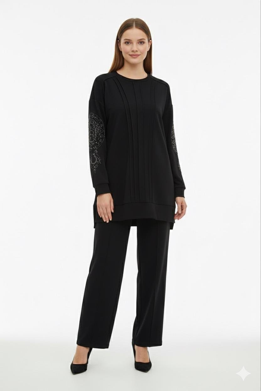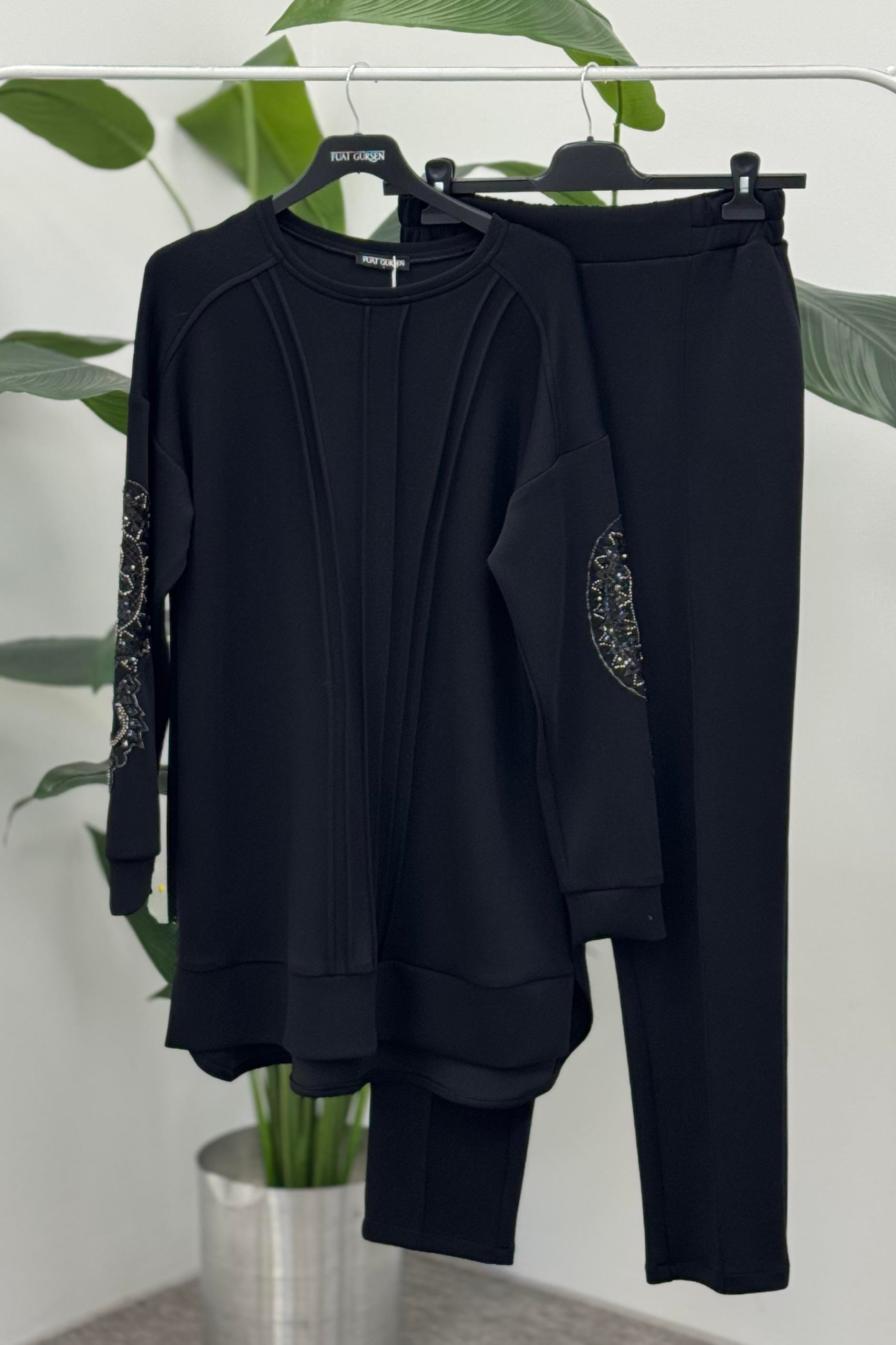 Fuat Gürşen 4339 Kolları İşlemeli Pantolonlu Takım - Siyah (350310917)