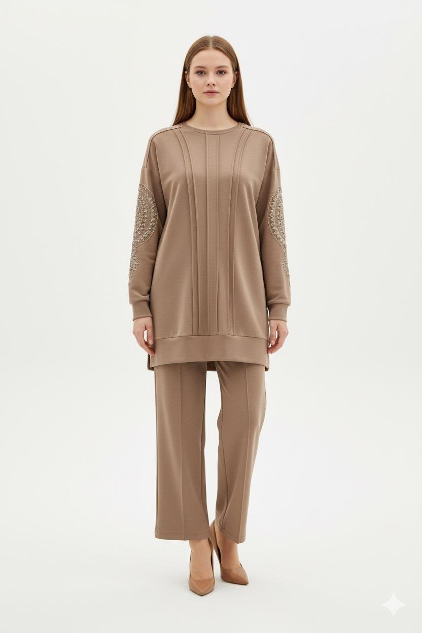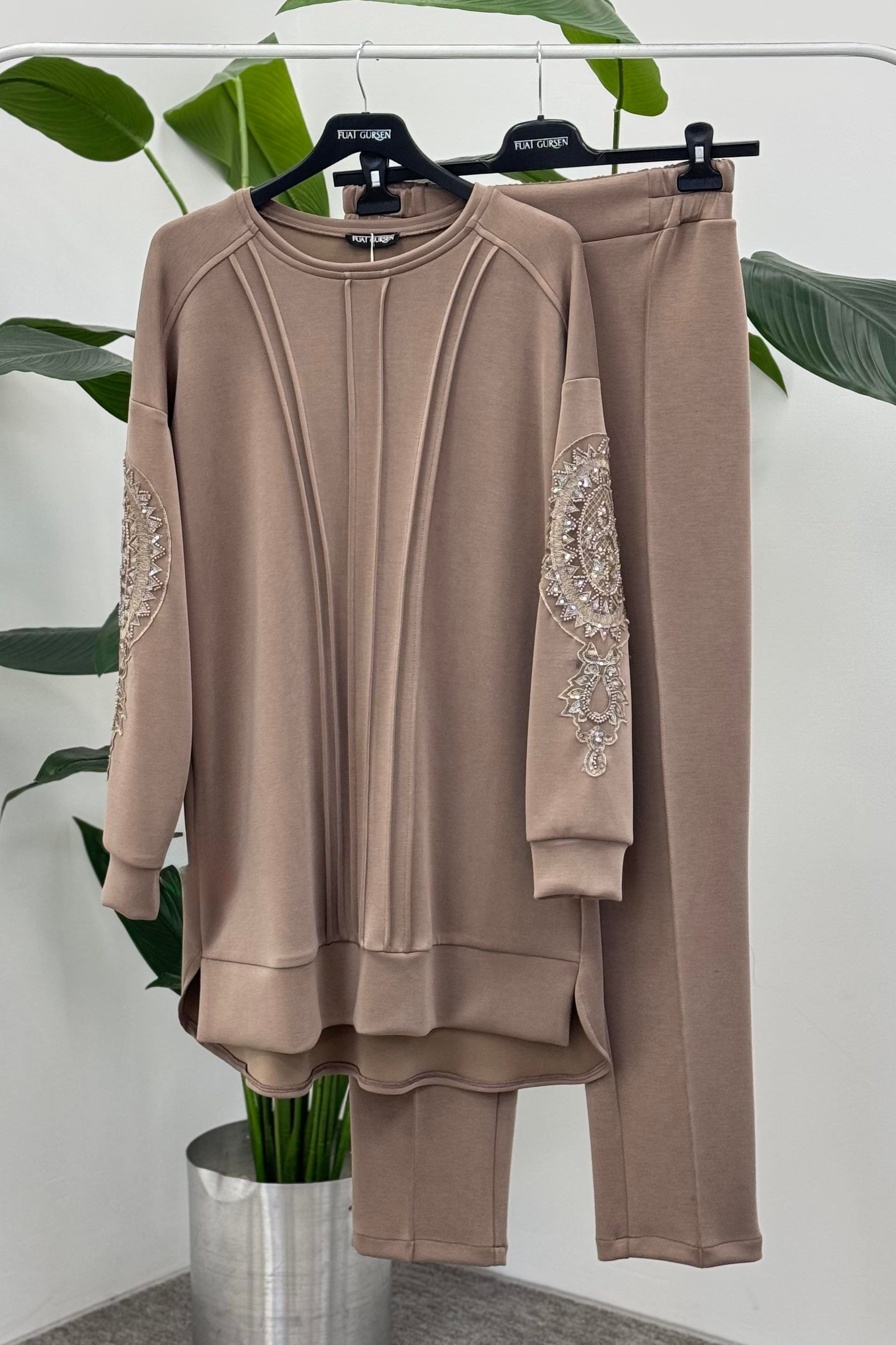 Fuat Gürşen 4339 Kolları İşlemeli Pantolonlu Takım - Vizon (350310917)