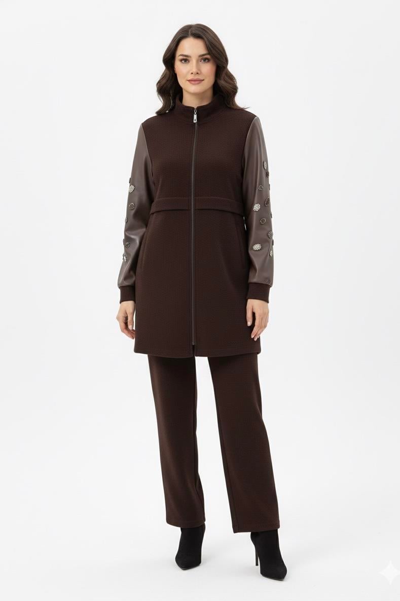 Fuat Gürşen 4625 Kol Taş İşlemeli Pantolonlu Takım - Kahve (350310926)