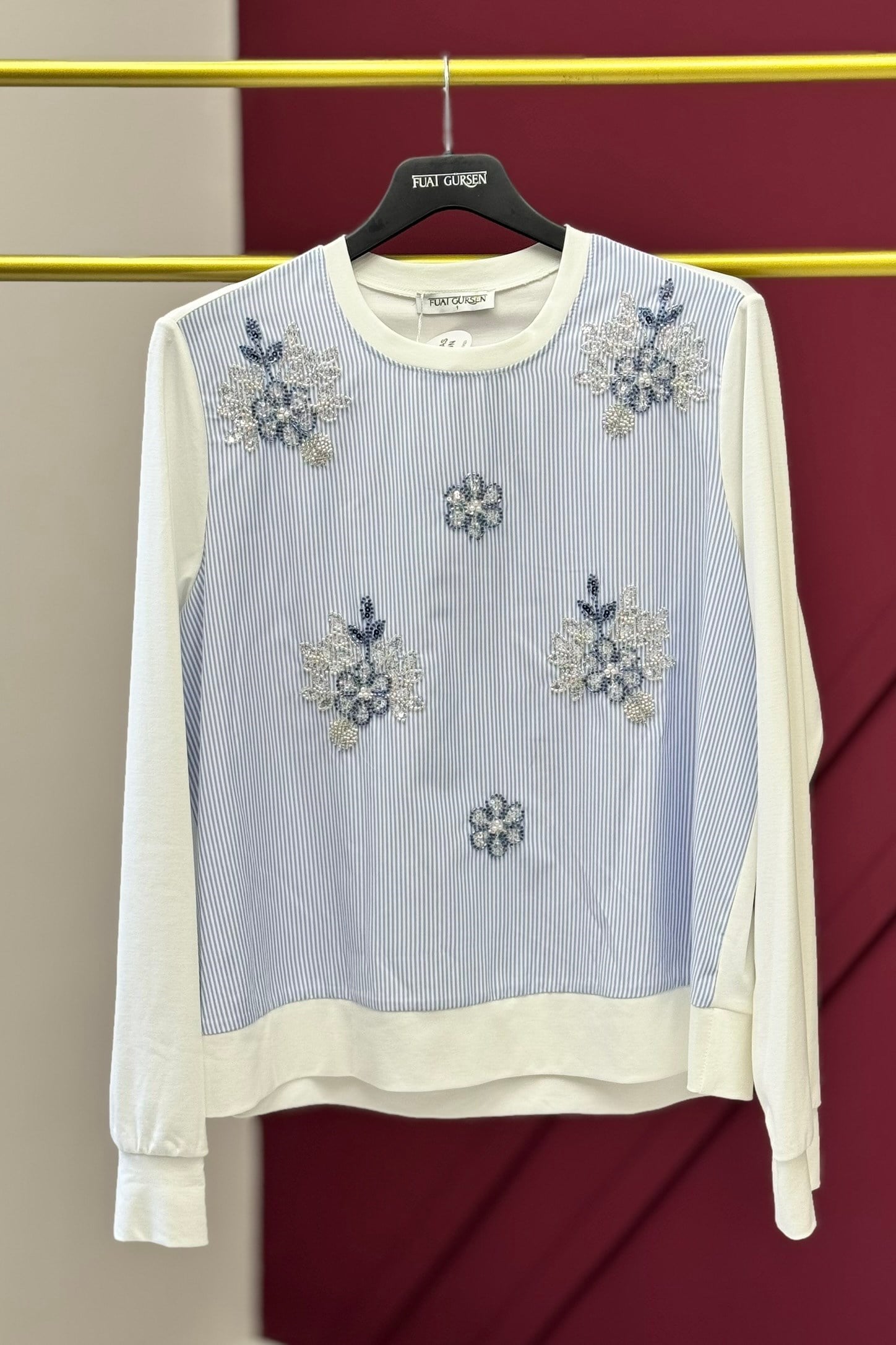 Fuat Gürşen 5350 Çizgi Detay Taş İşlemeli Bluz - Bebe Mavisi