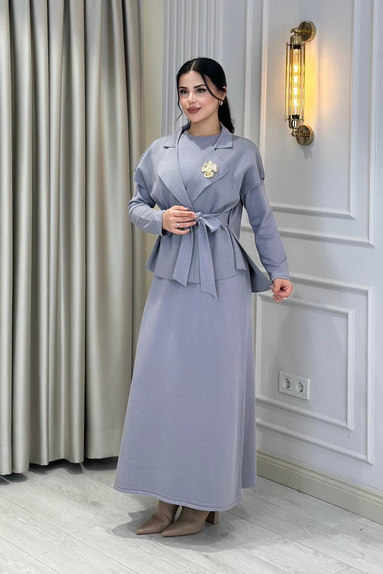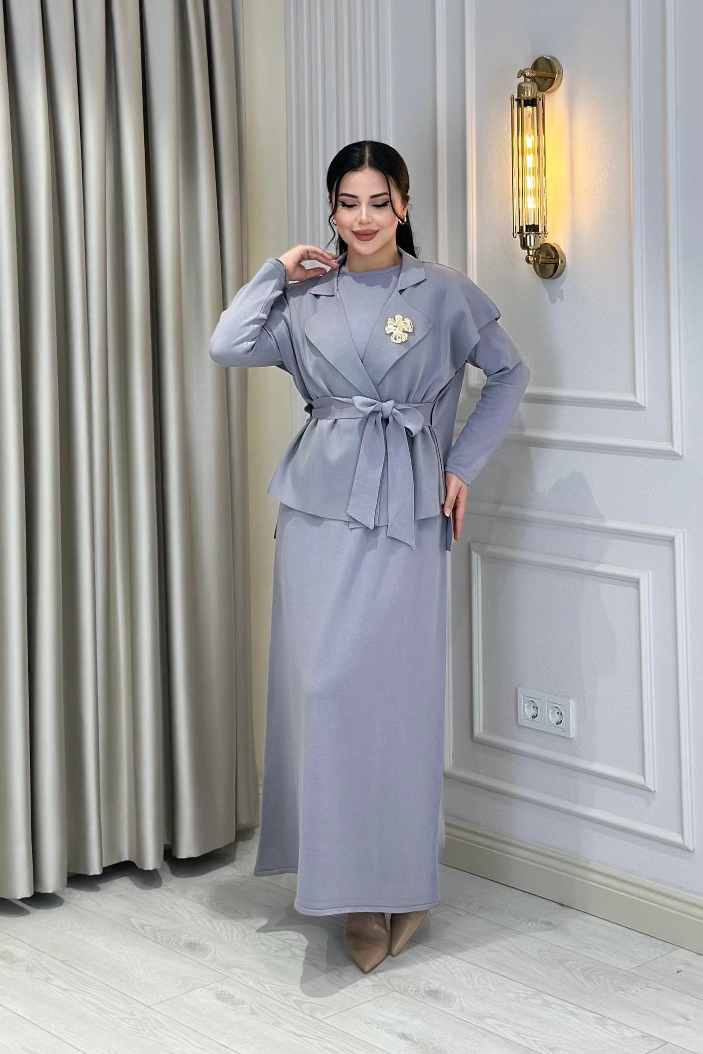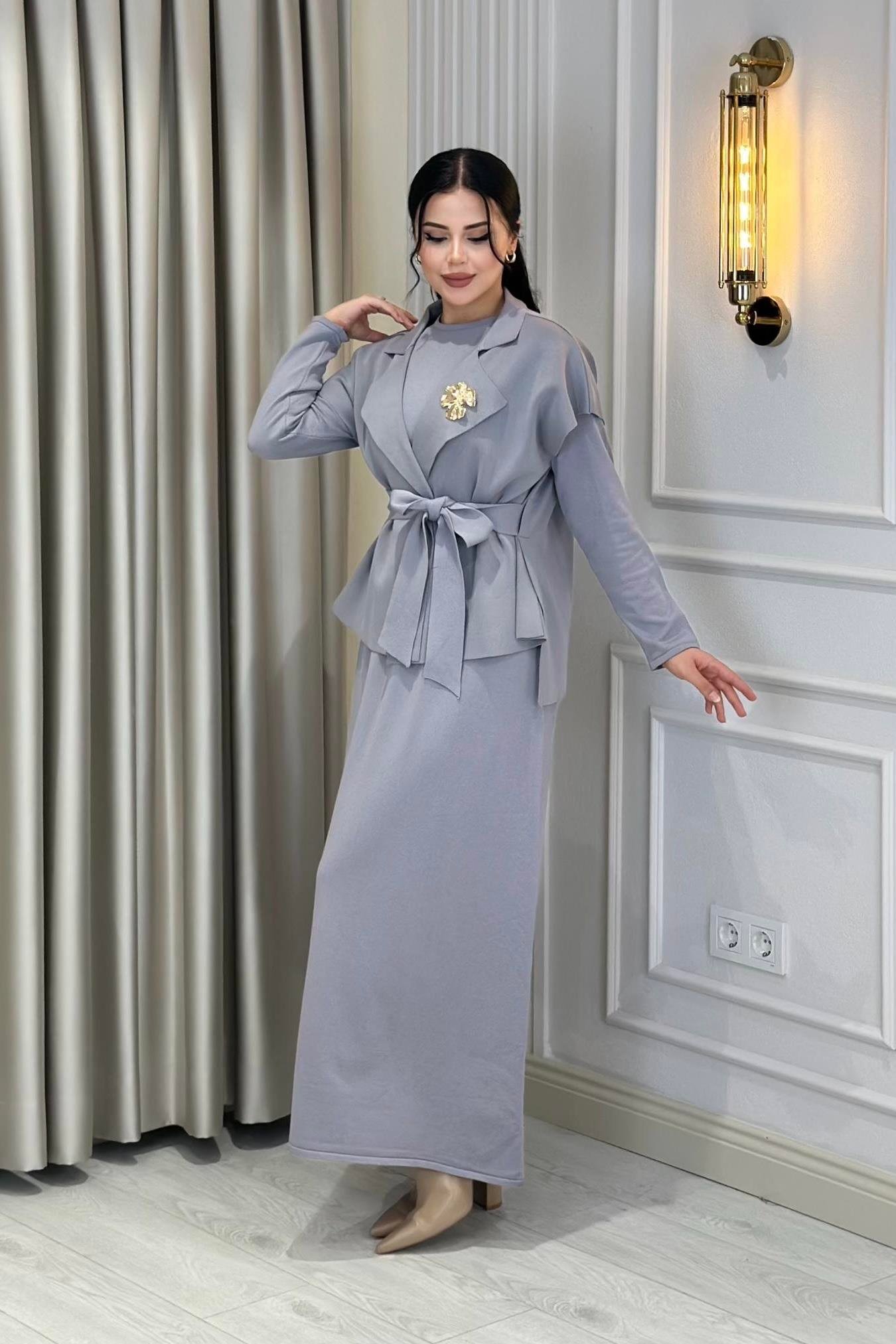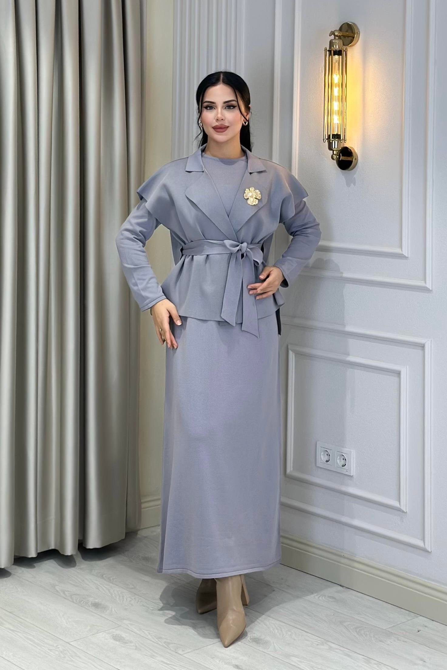 Jupe 1401 Broş Detaylı Triko İkili Elbise - Antrasit (363125901)
