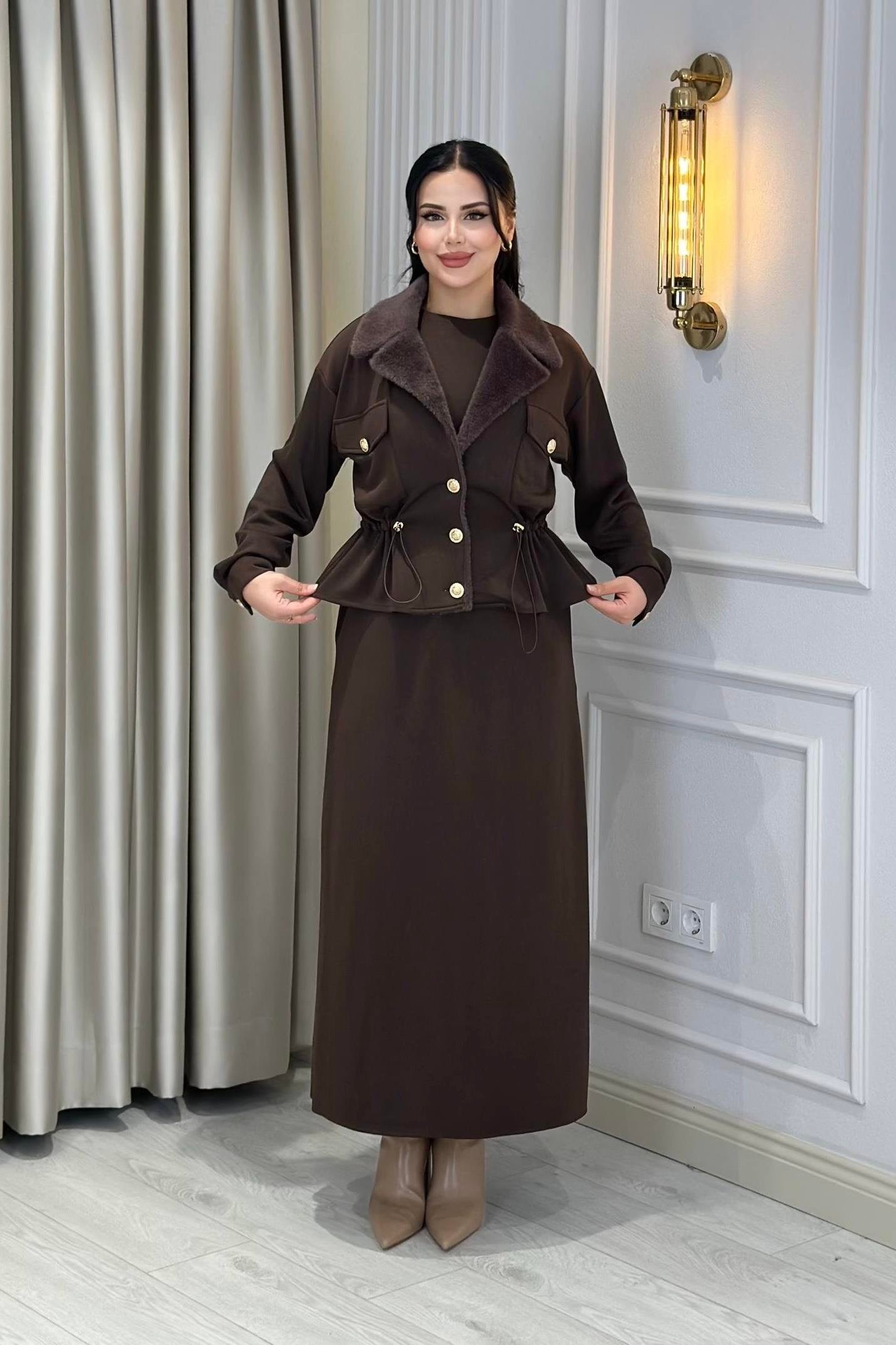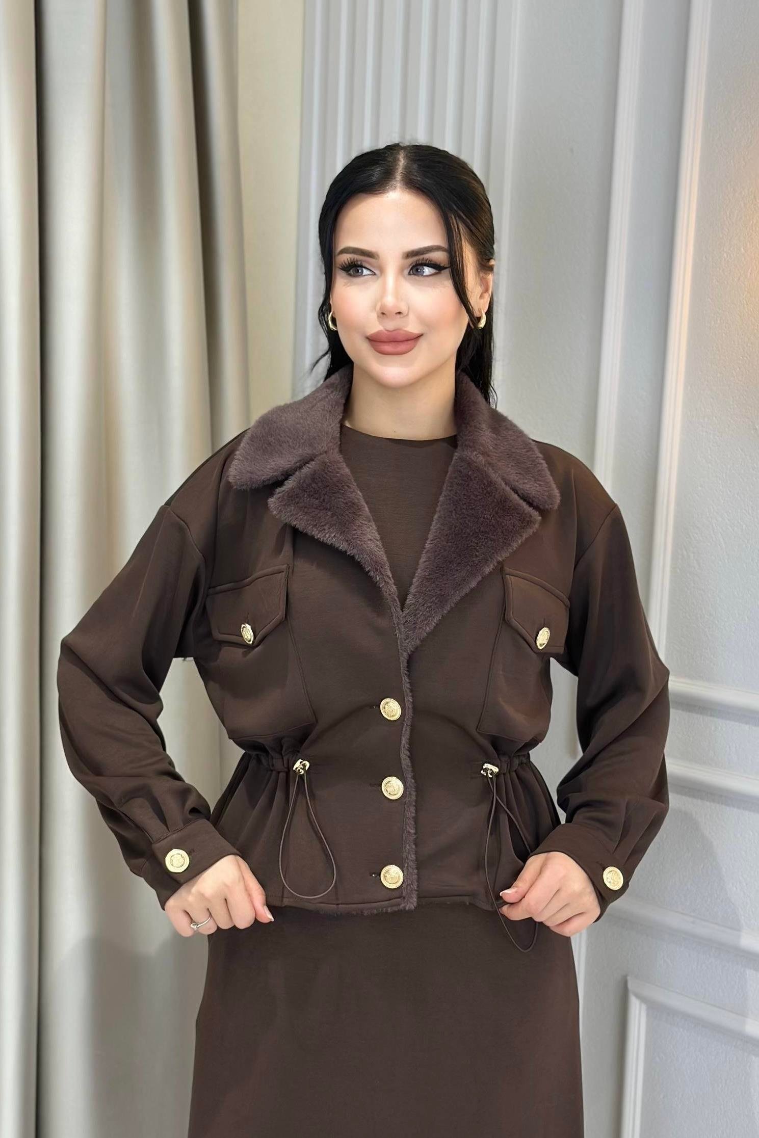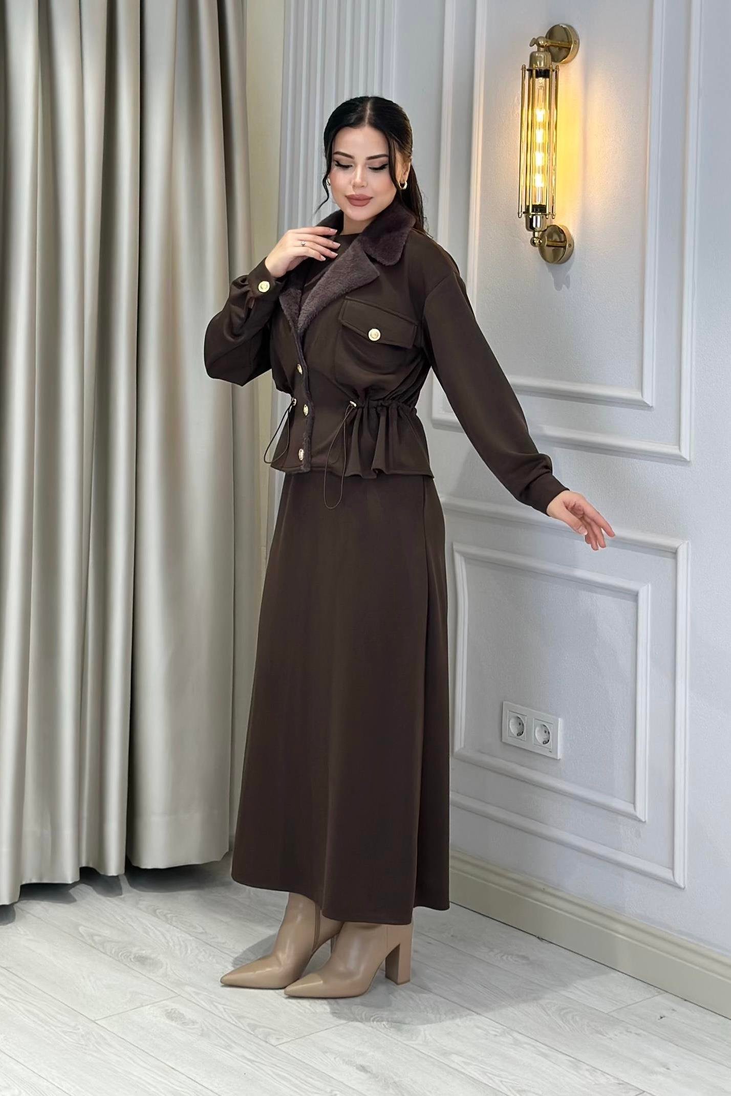 Jupe 7262 Ceketi Kürk Detay İkili Elbise - Kahve (363125900)