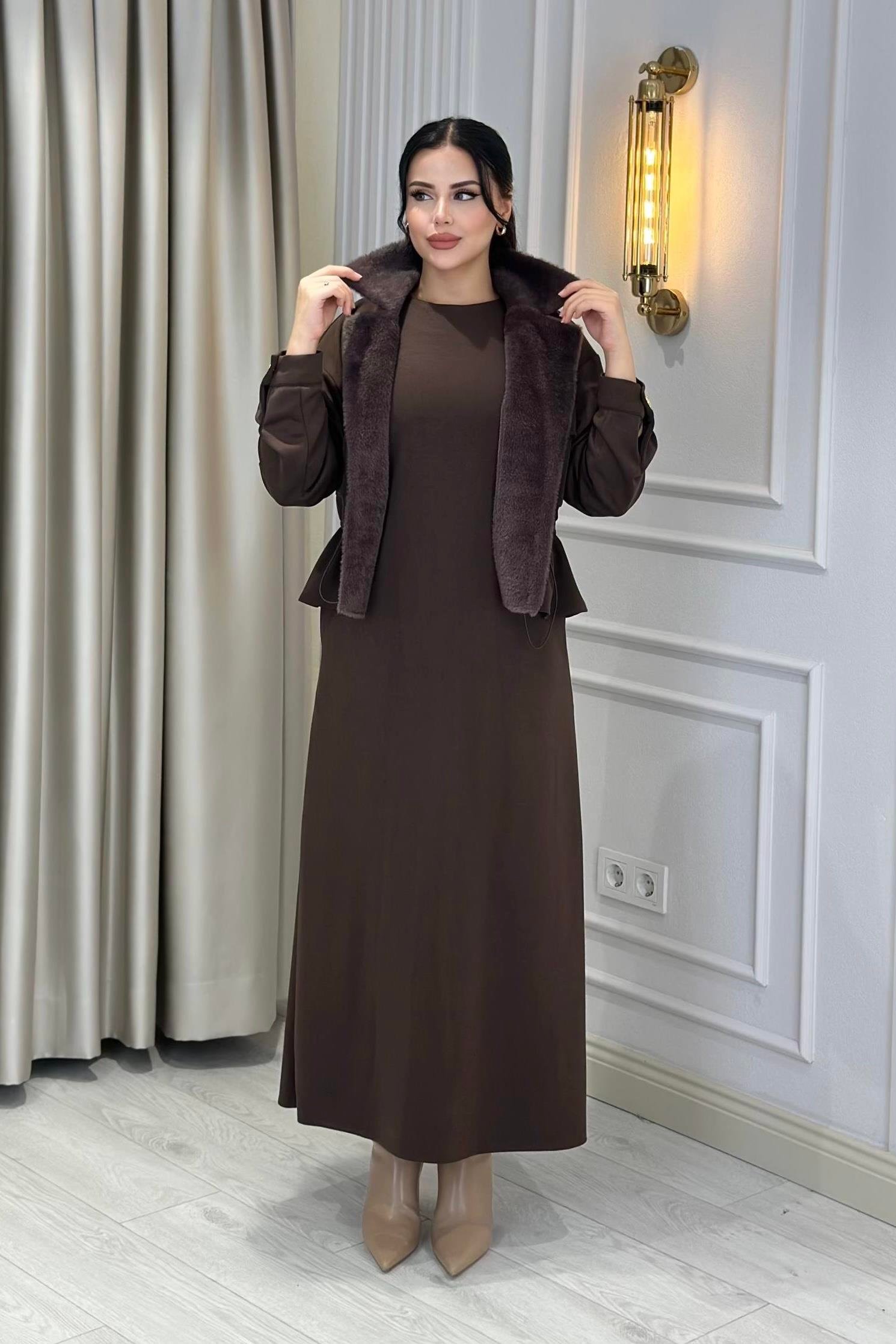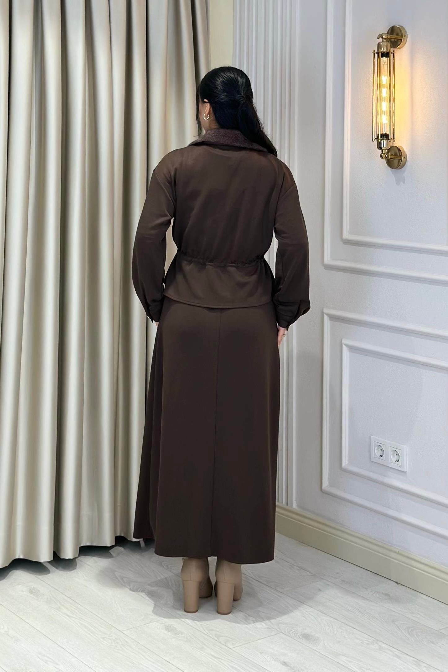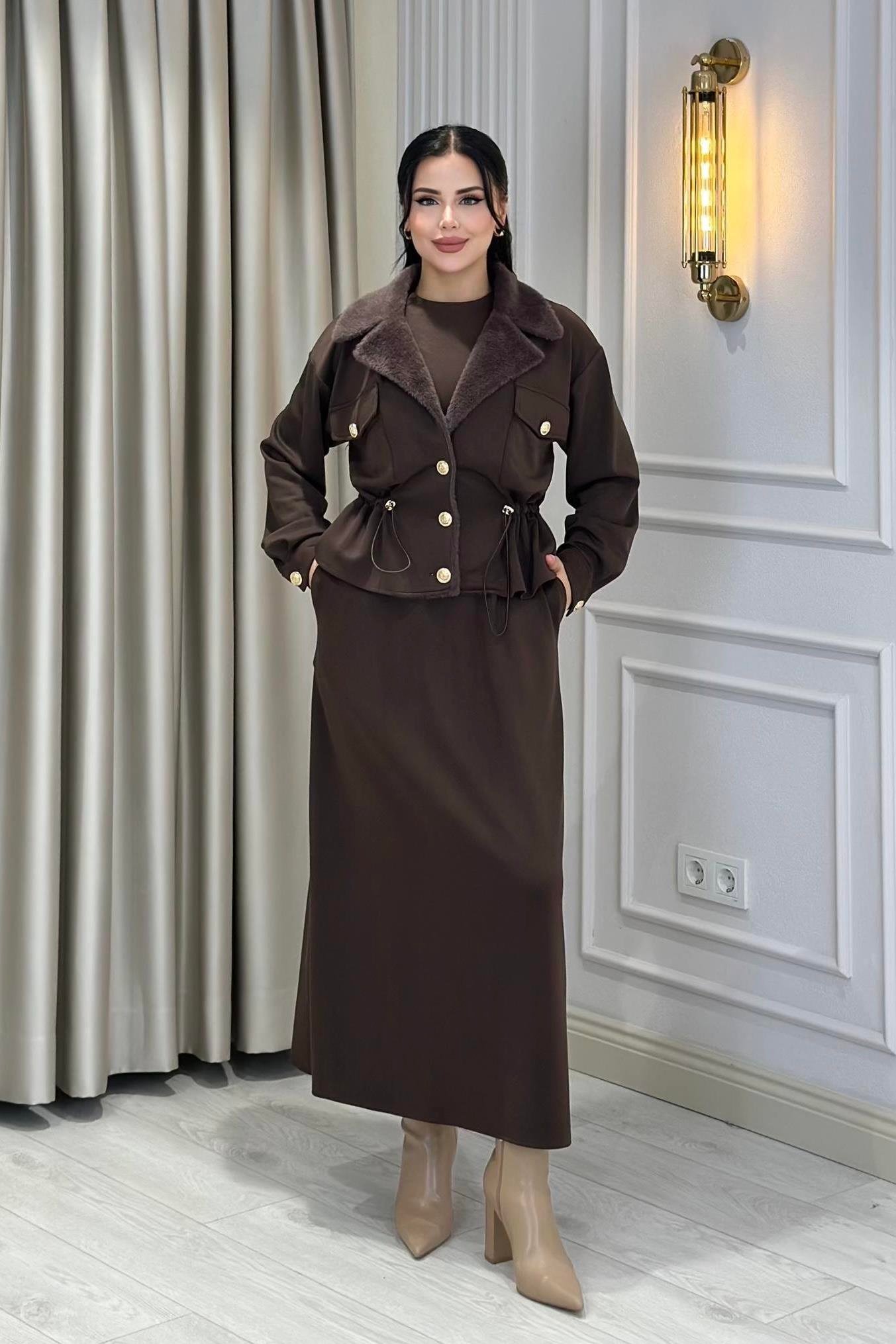 Jupe 7262 Ceketi Kürk Detay İkili Elbise - Kahve (363125900)