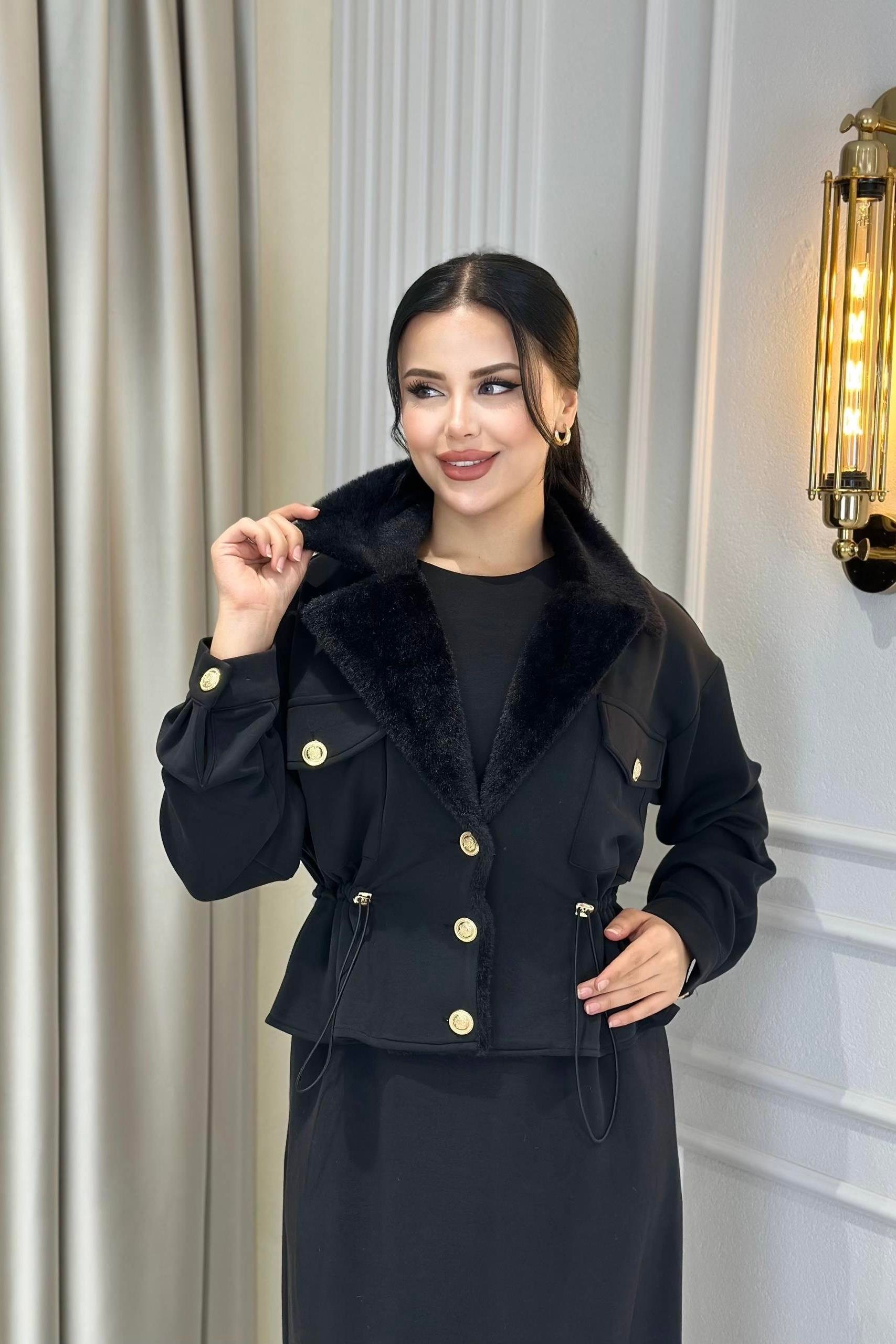 Jupe 7262 Ceketi Kürk Detay İkili Elbise - Siyah