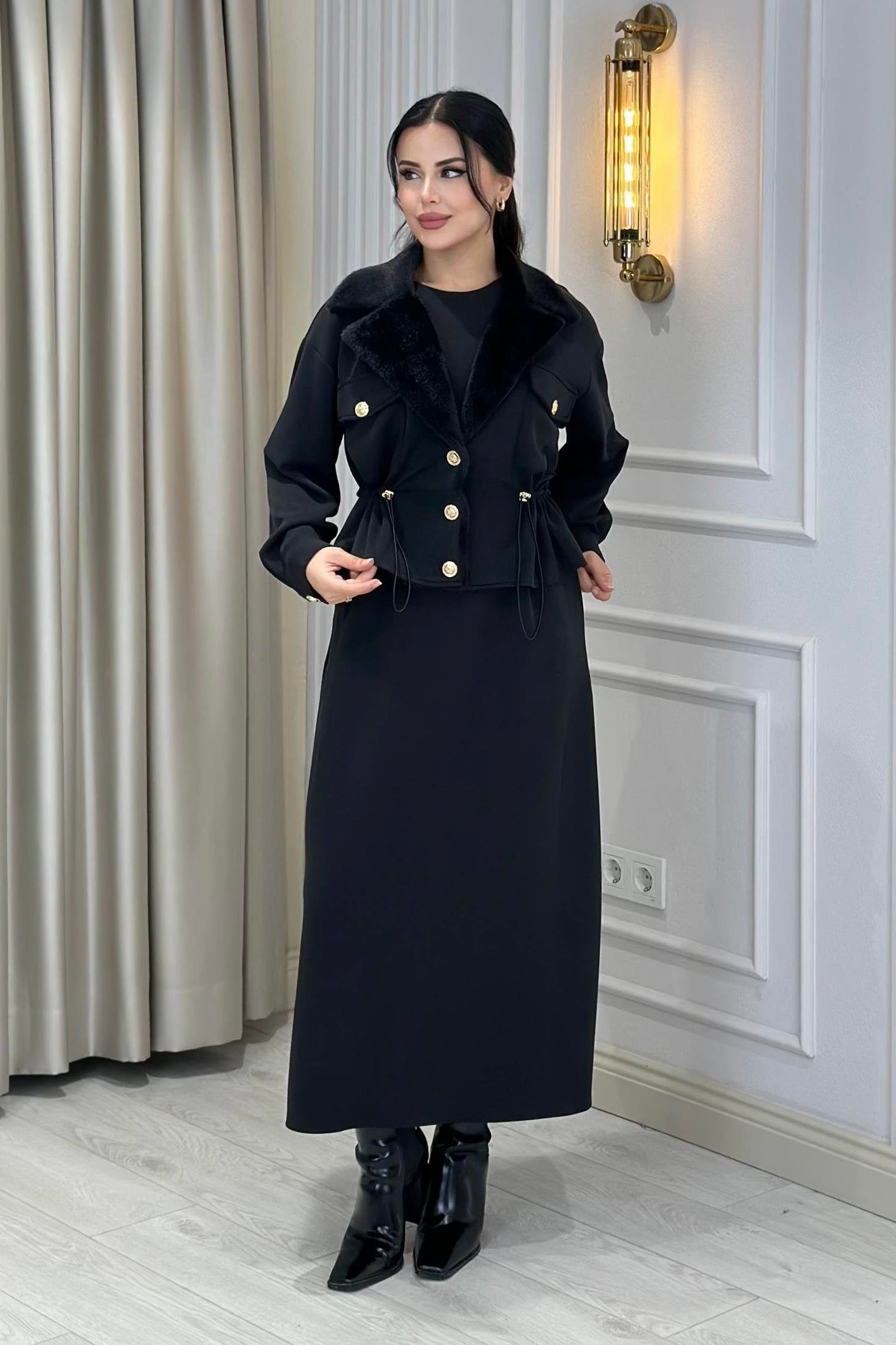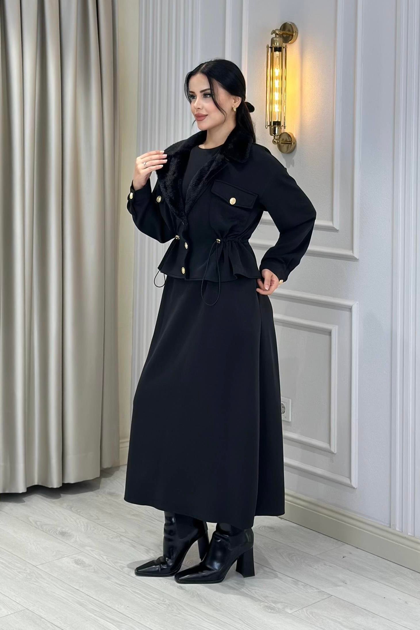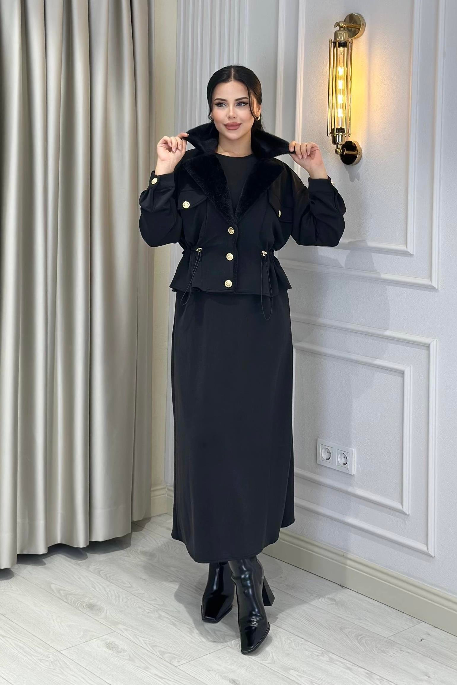 Jupe 7262 Ceketi Kürk Detay İkili Elbise - Siyah (363125900)