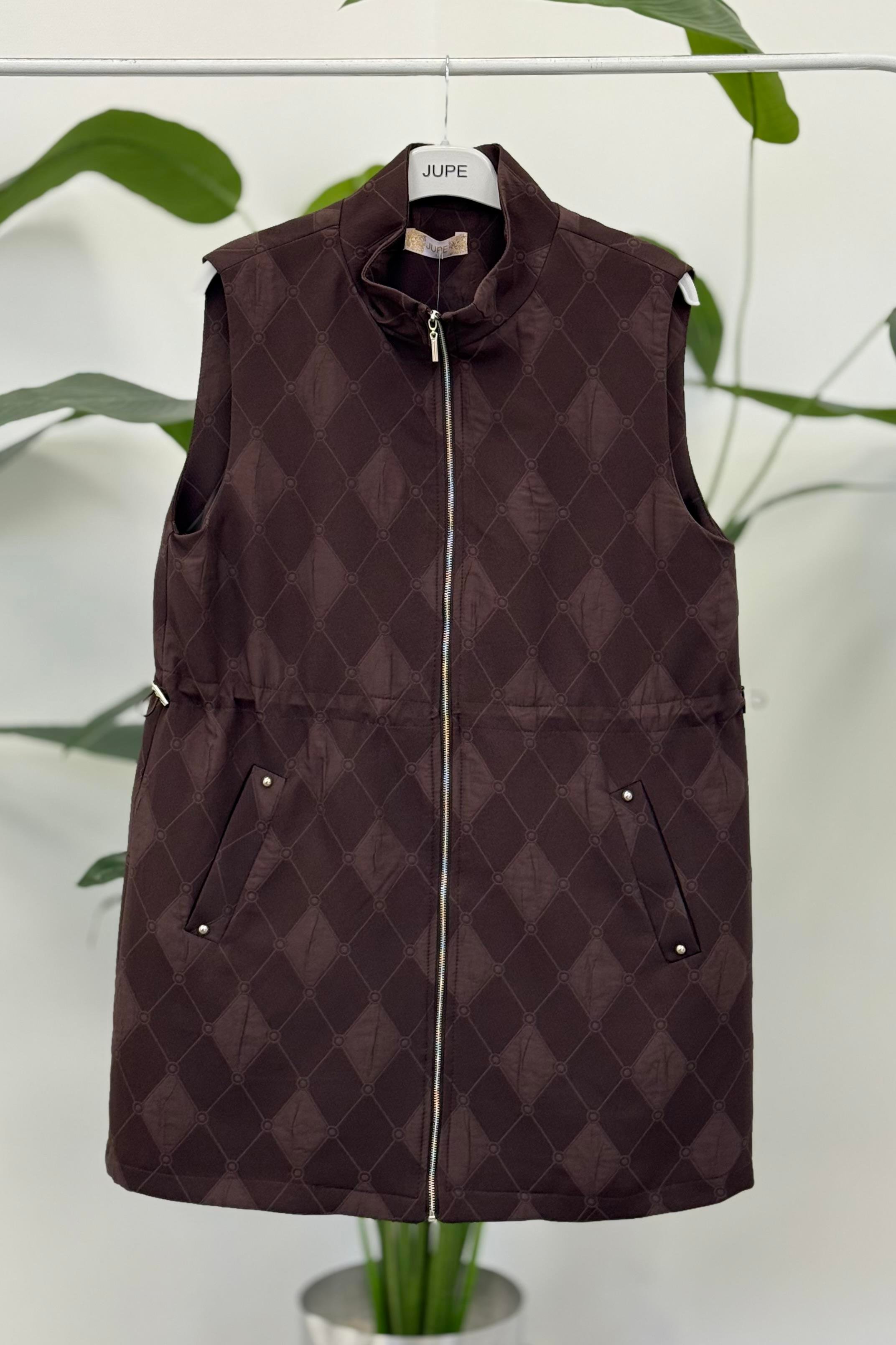 Jupe 9269 Kendinden Baklava Desenli Fermuarlı Yelek - Kahve