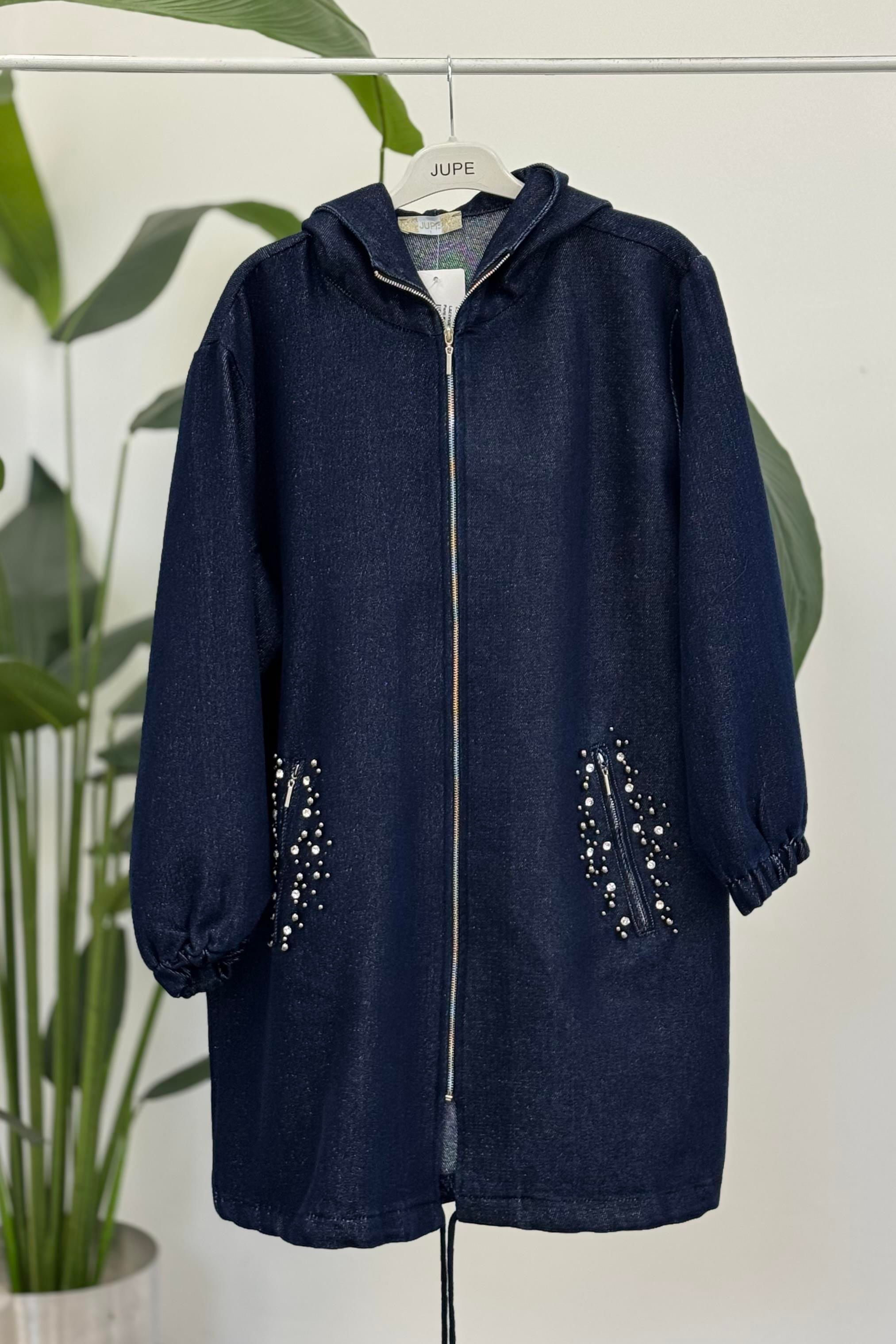 Jupe 9276 Cep Yanları Taş İşlemeli Kapüşonlu Kap - Lacivert