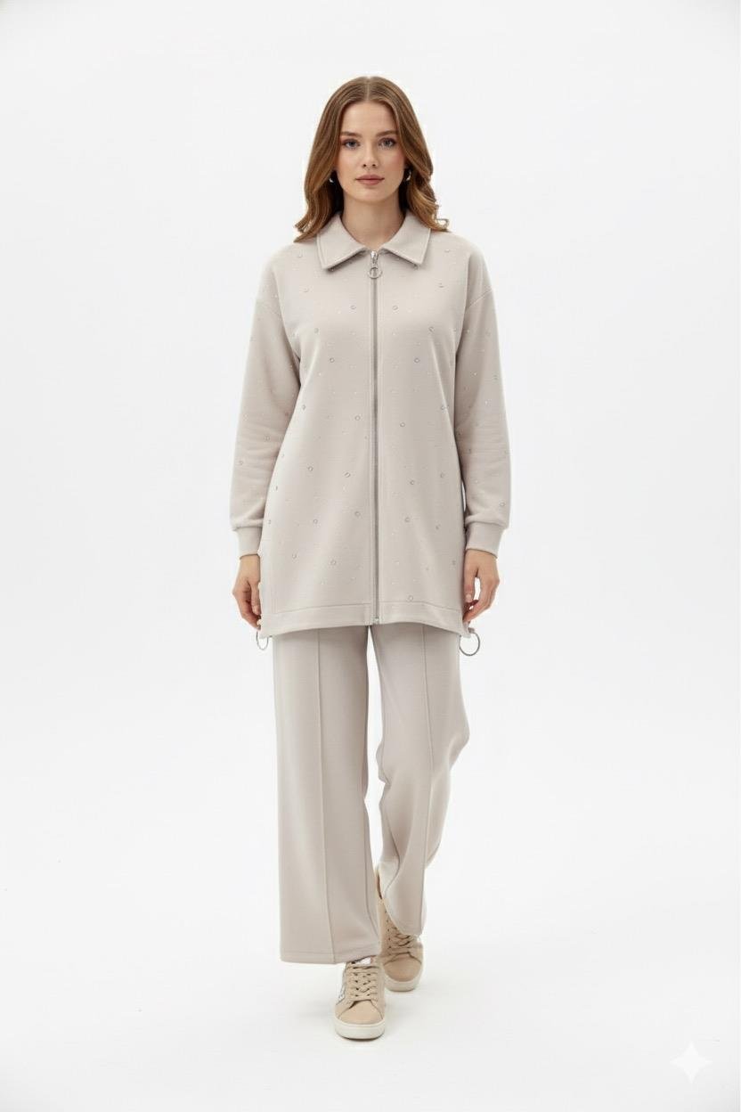 Kuşgözü ve Taş Baskılı Pantolonlu Takım 3051 - Taş