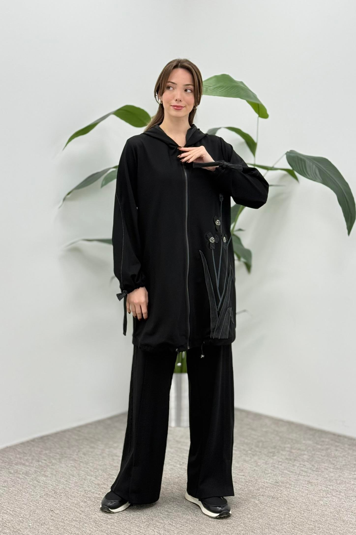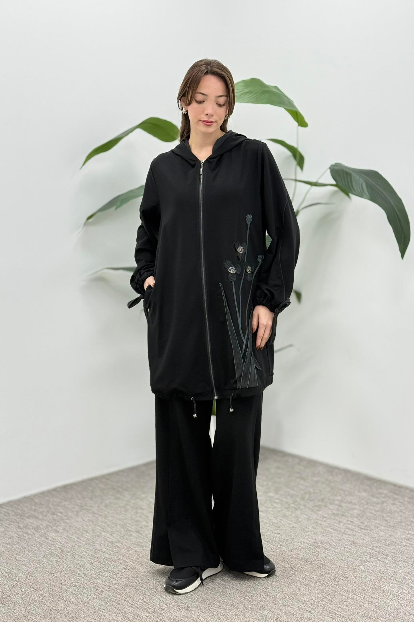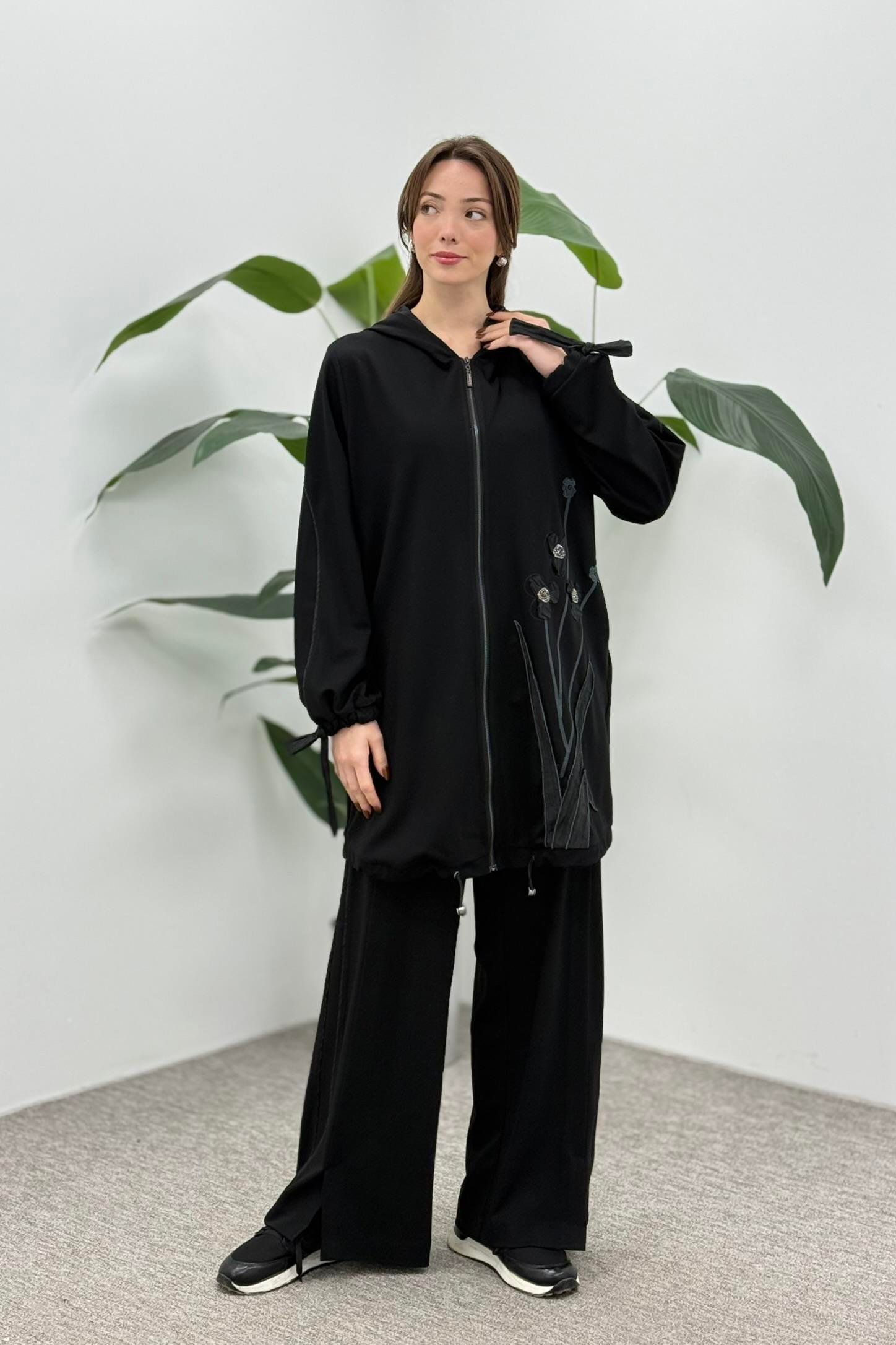 LissmMore 5945 Bir Yanı Çiçek İşlemeli Pantolonlu Takım - Siyah