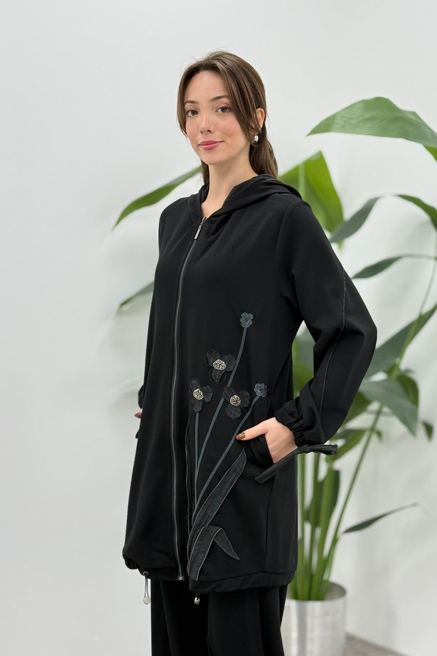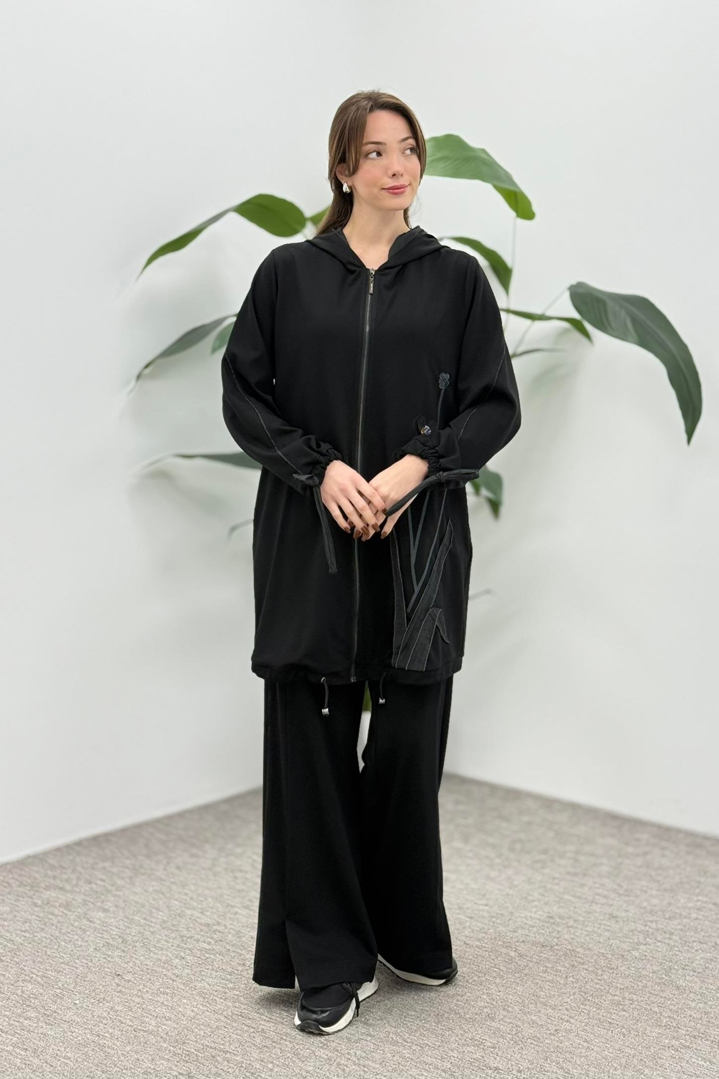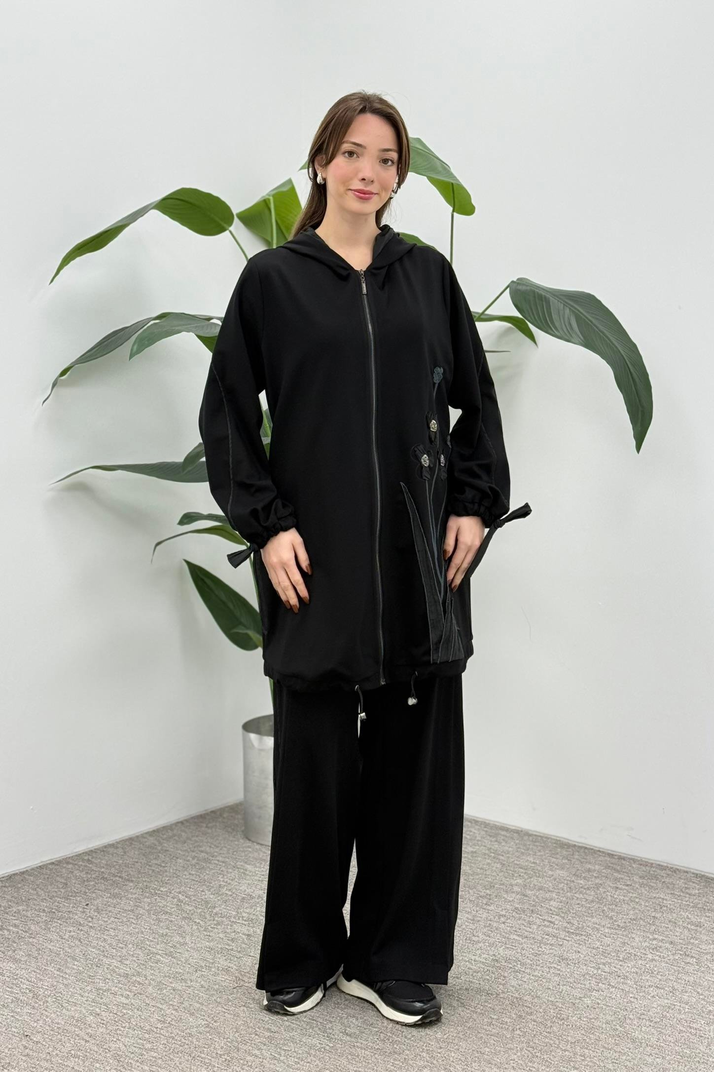 LissmMore 5945 Bir Yanı Çiçek İşlemeli Pantolonlu Takım - Siyah