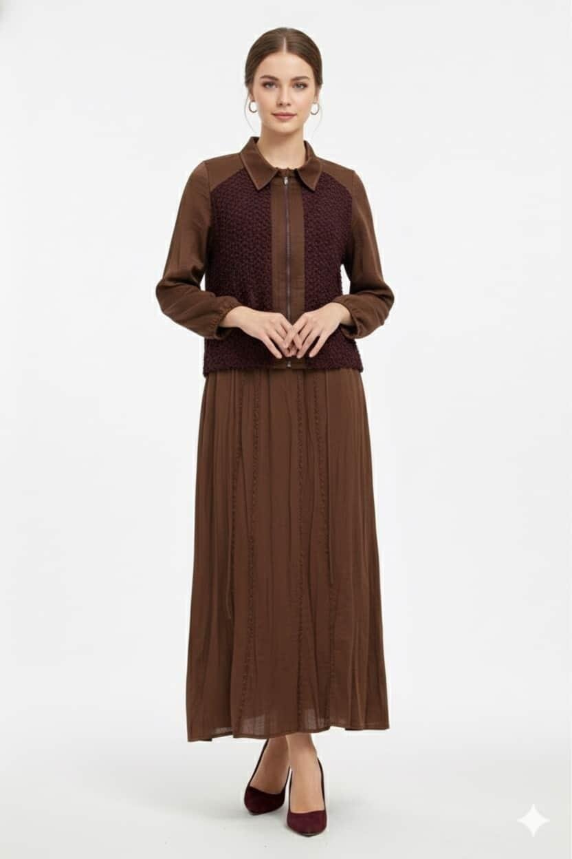 LissMore 5988 Yelek Detaylı Parlak Elbise - Kahve