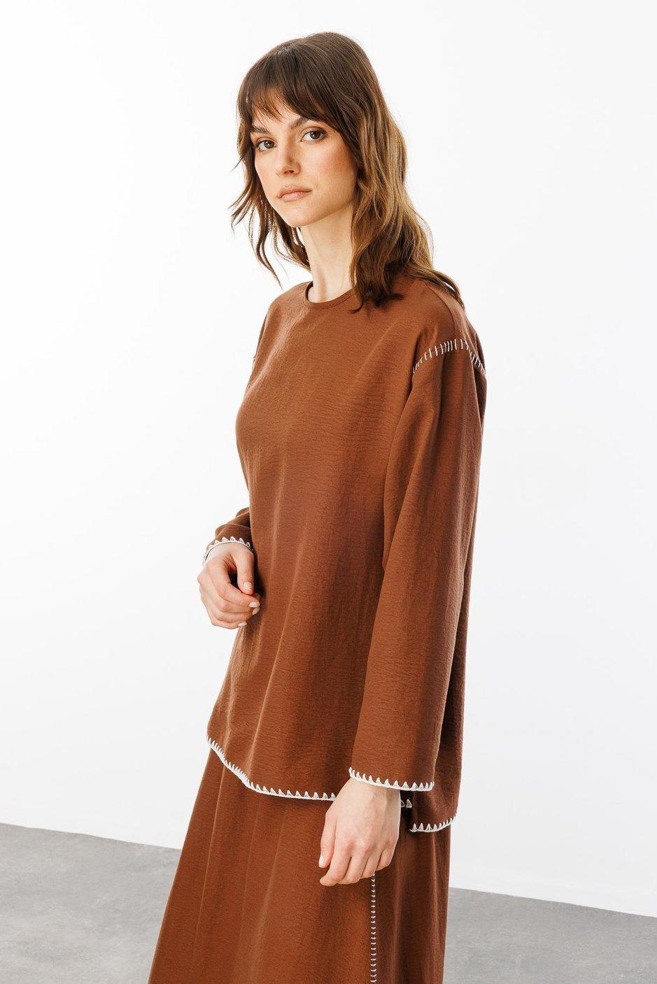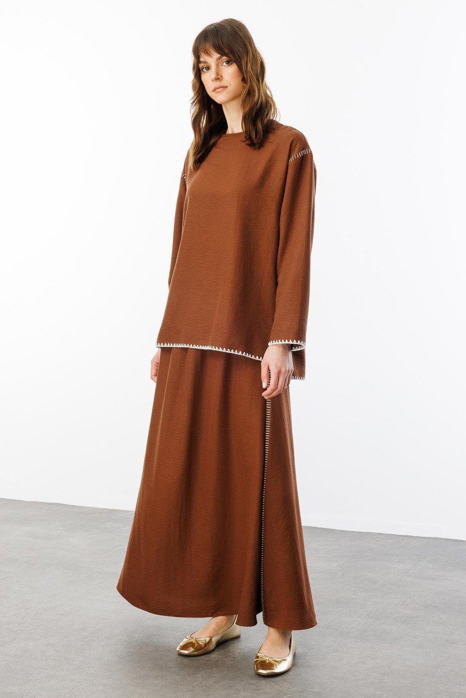 Micca 251883M Kenar Nakış Detaylı İpekçe Doku Etekli Takım - Kahve (350103815)