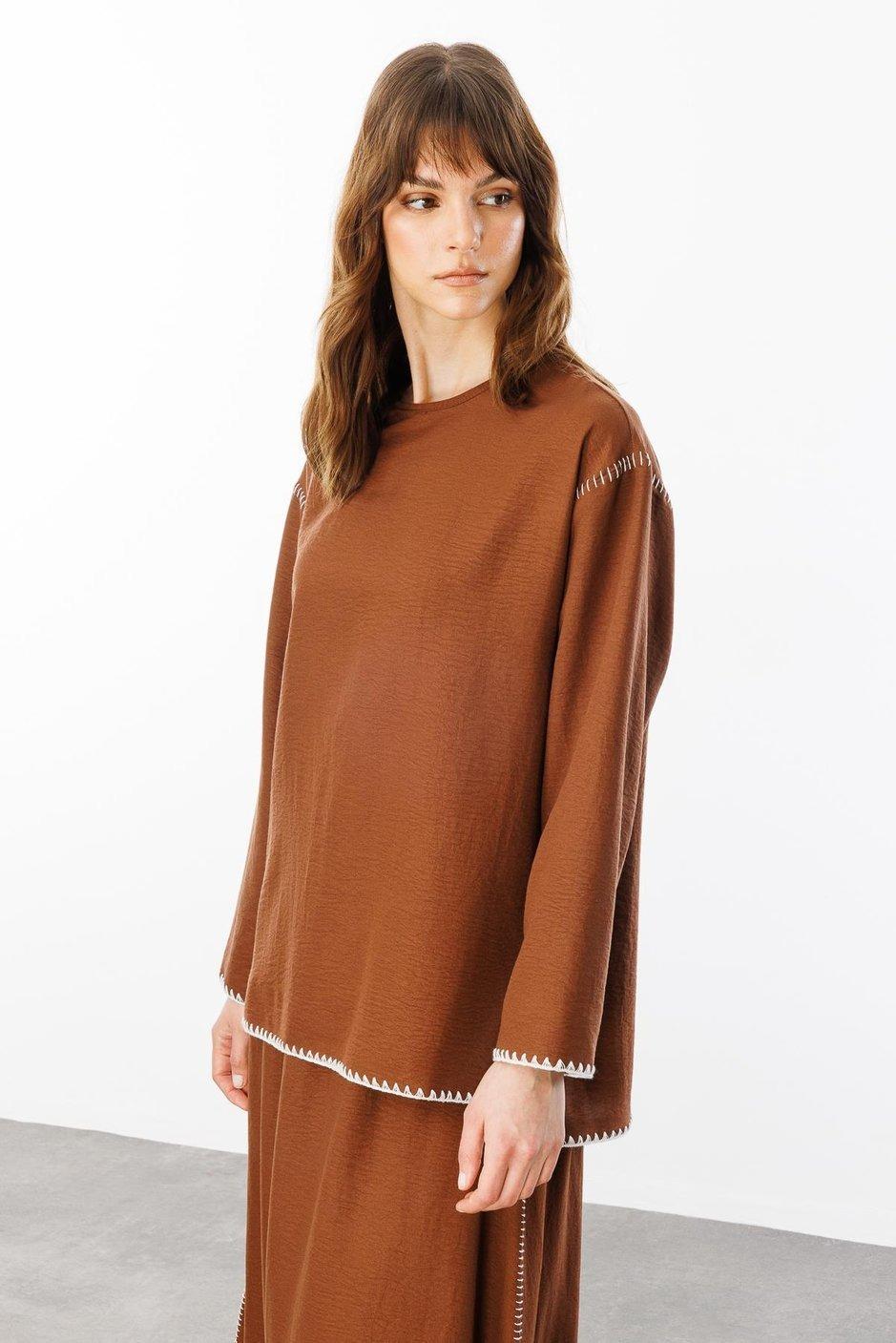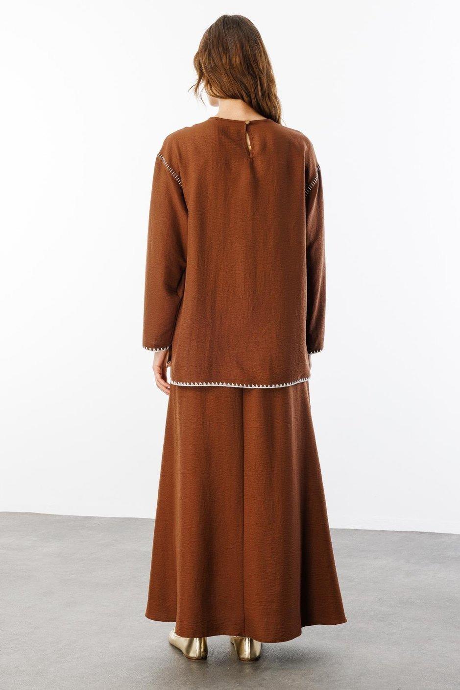 Micca 251883M Kenar Nakış Detaylı İpekçe Doku Etekli Takım - Kahve
