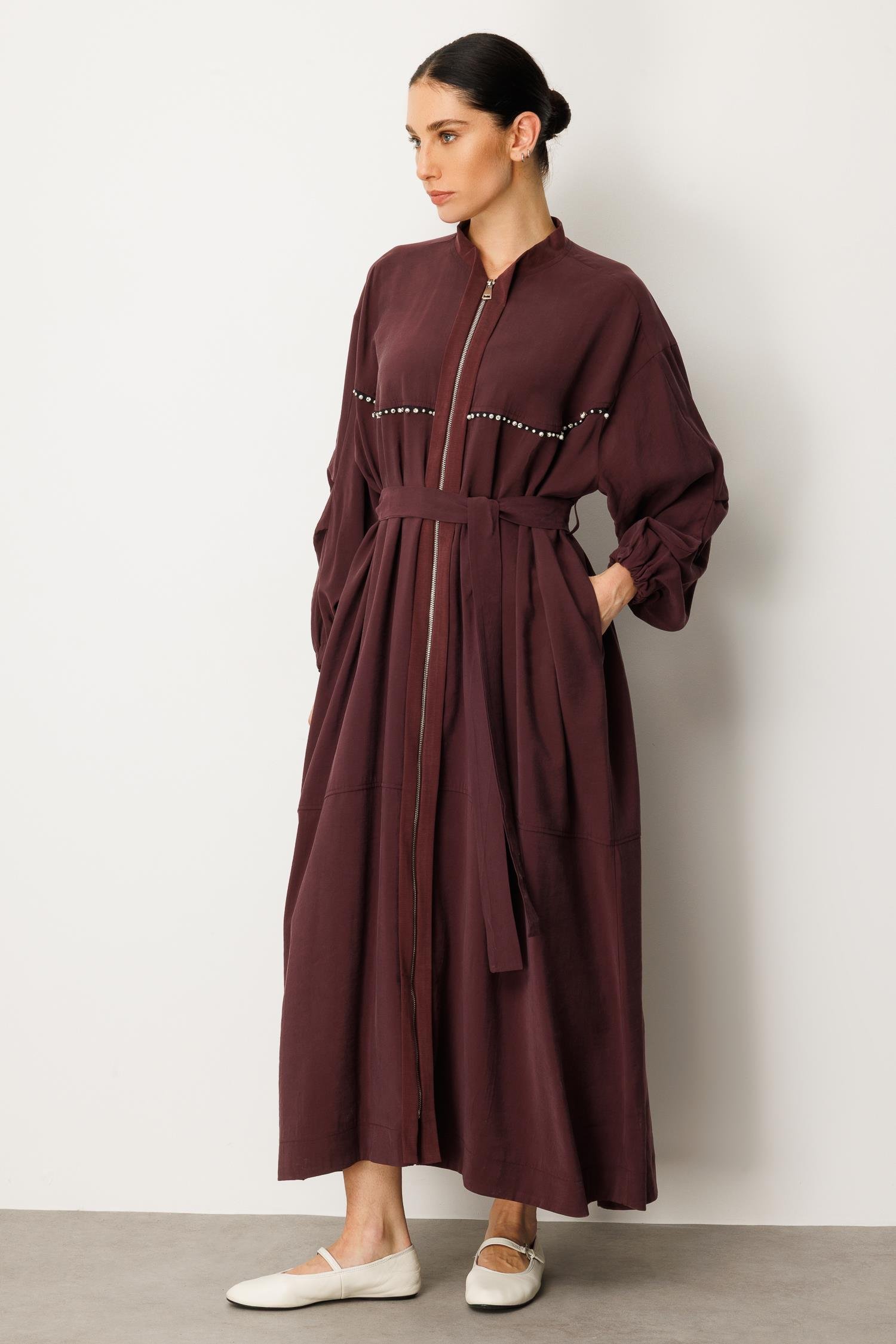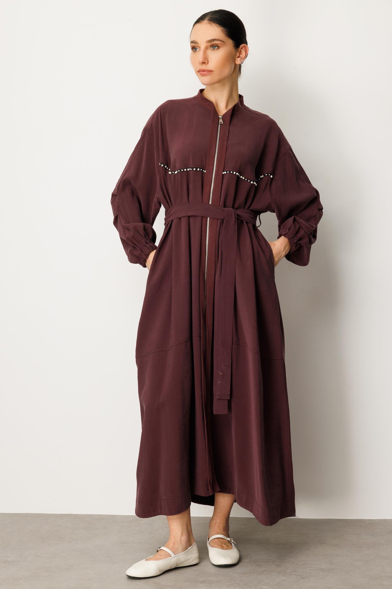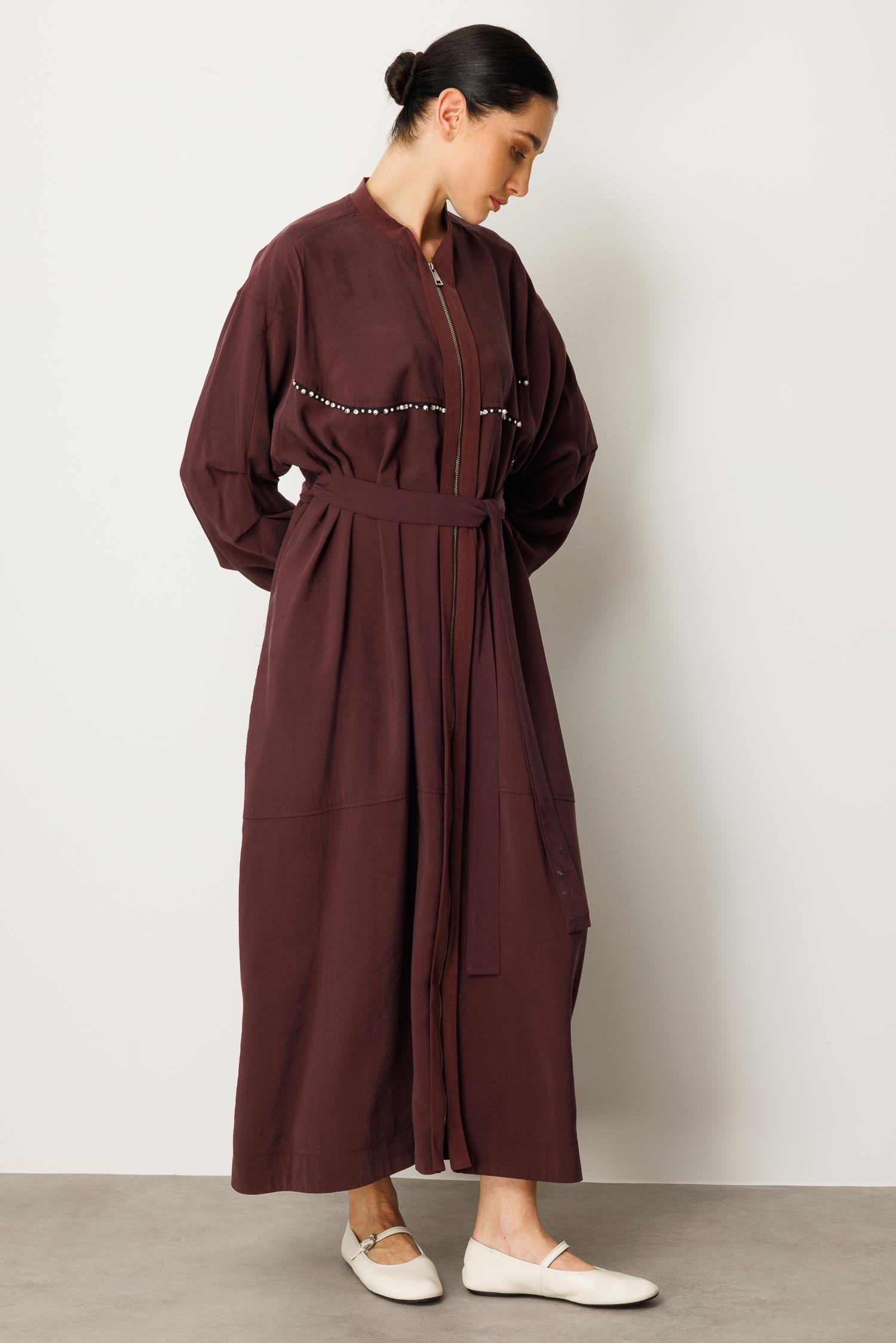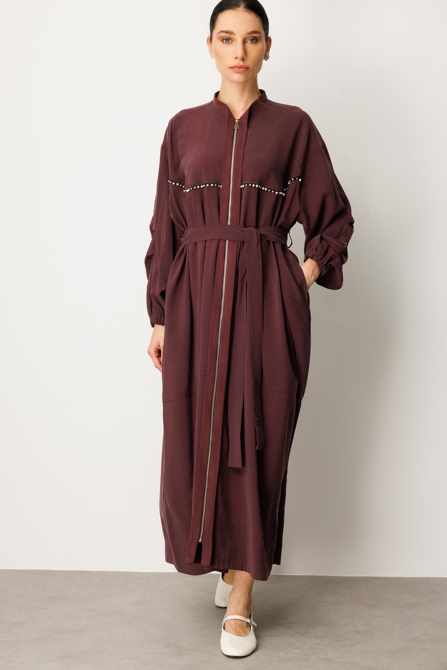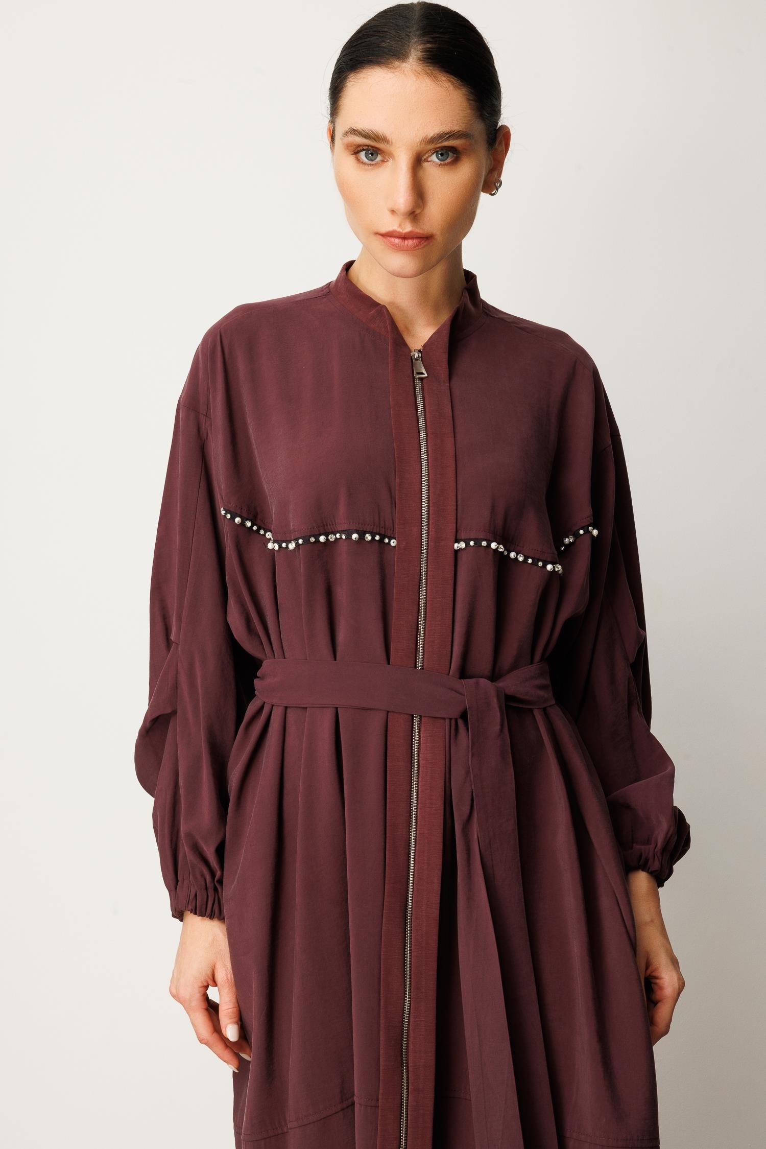 Micca 252564M Taş ve Boncuk İşlemeli Fermuarlı Ferace - Bordo