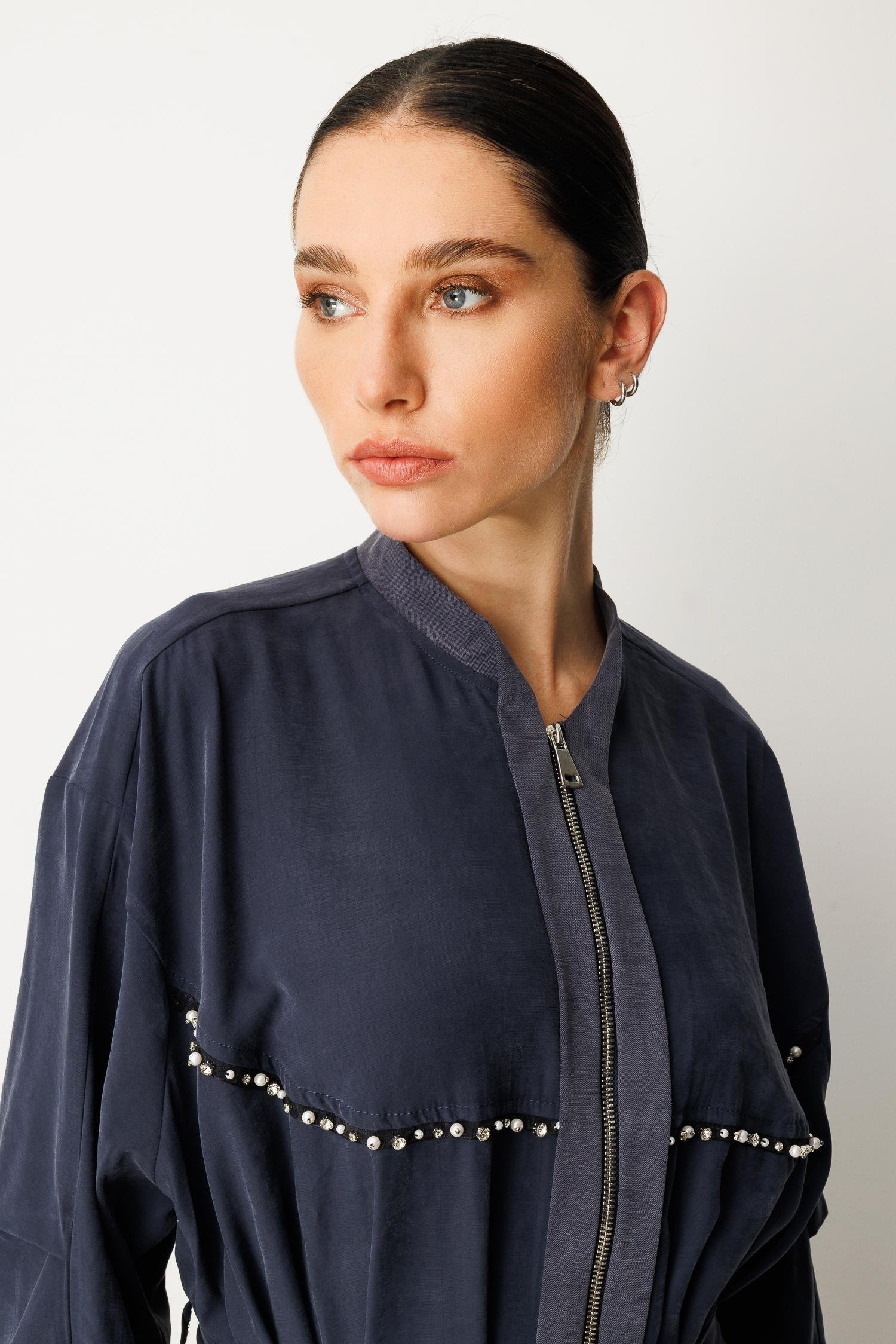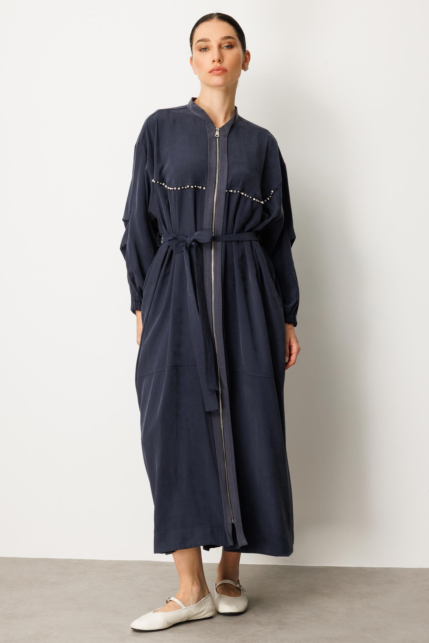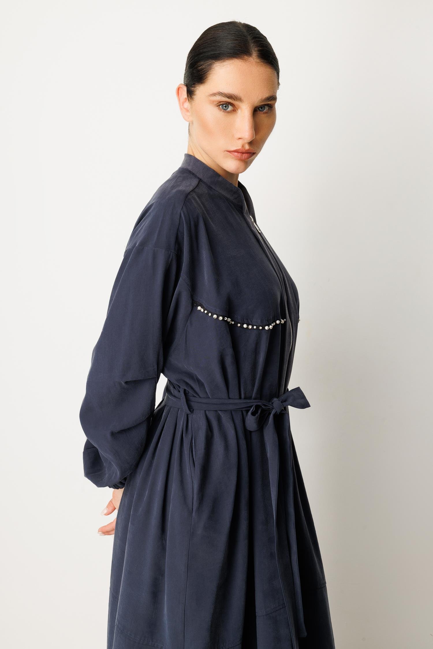 Micca 252564M Taş ve Boncuk İşlemeli Fermuarlı Ferace - Lacivert