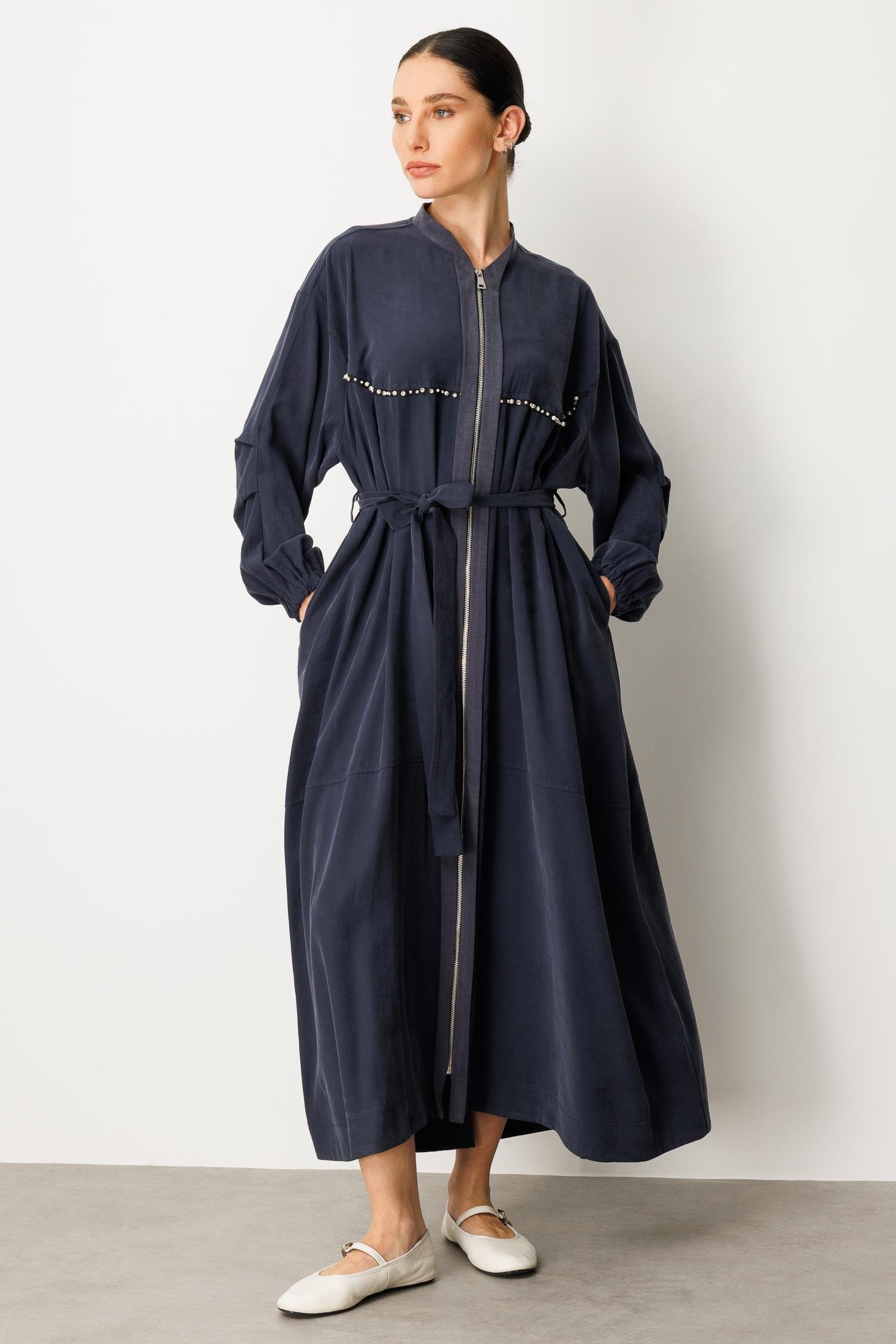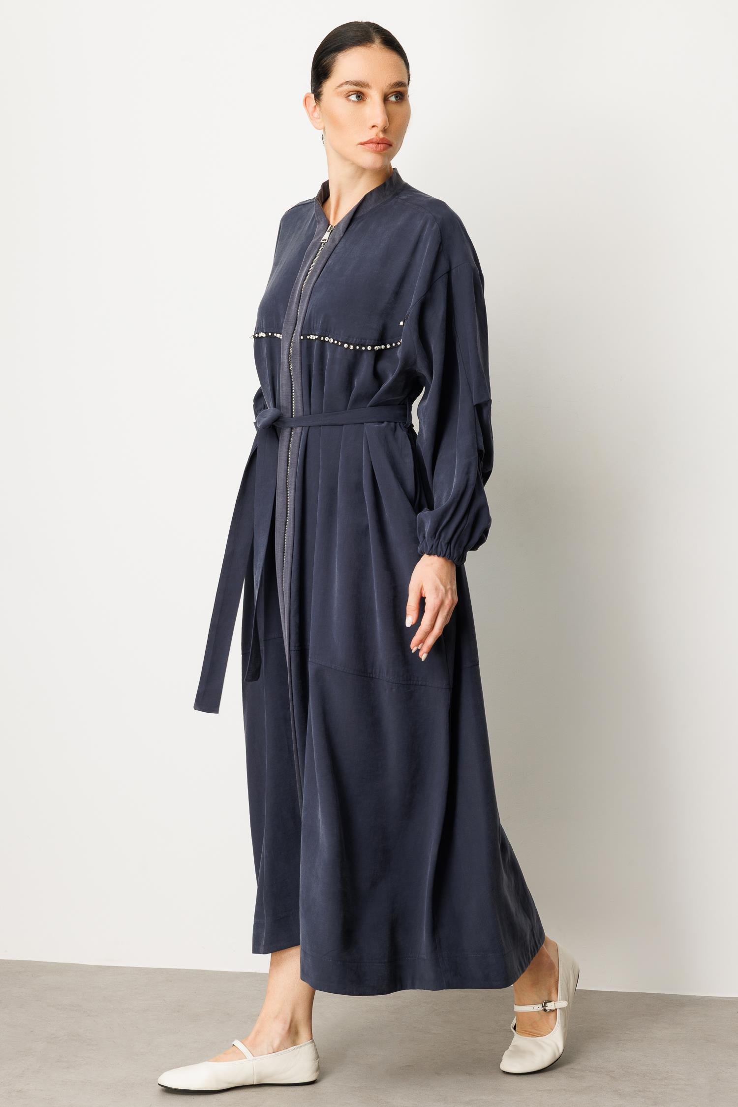 Micca 252564M Taş ve Boncuk İşlemeli Fermuarlı Ferace - Lacivert (378103910)