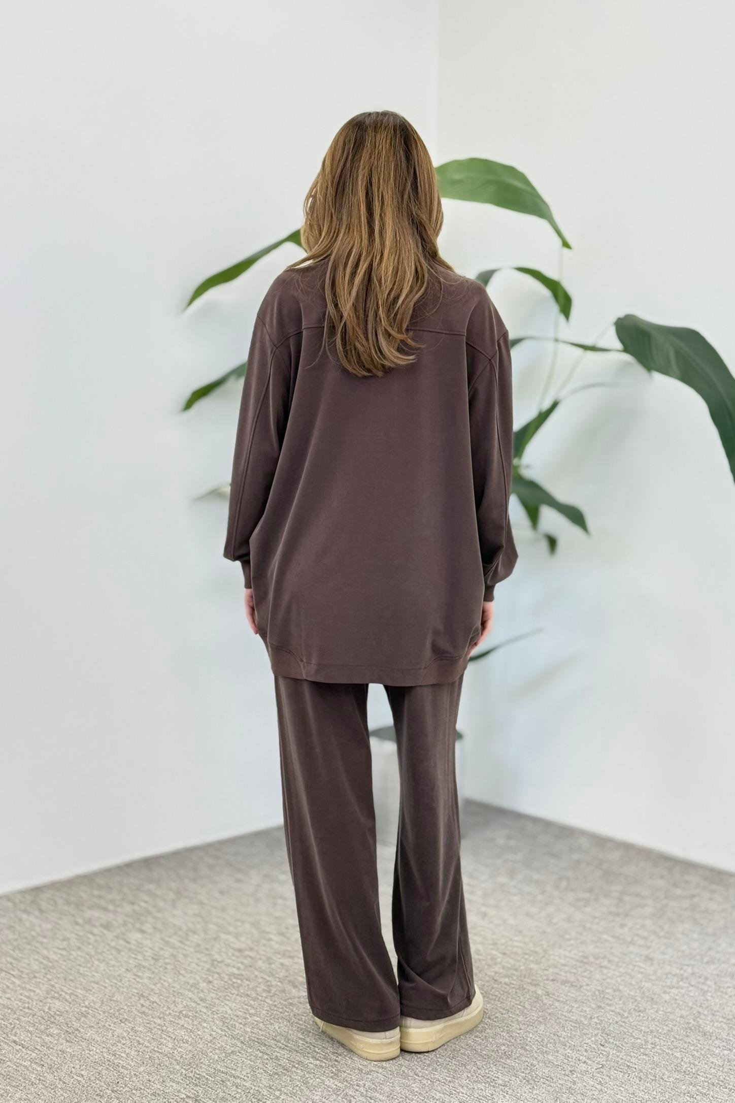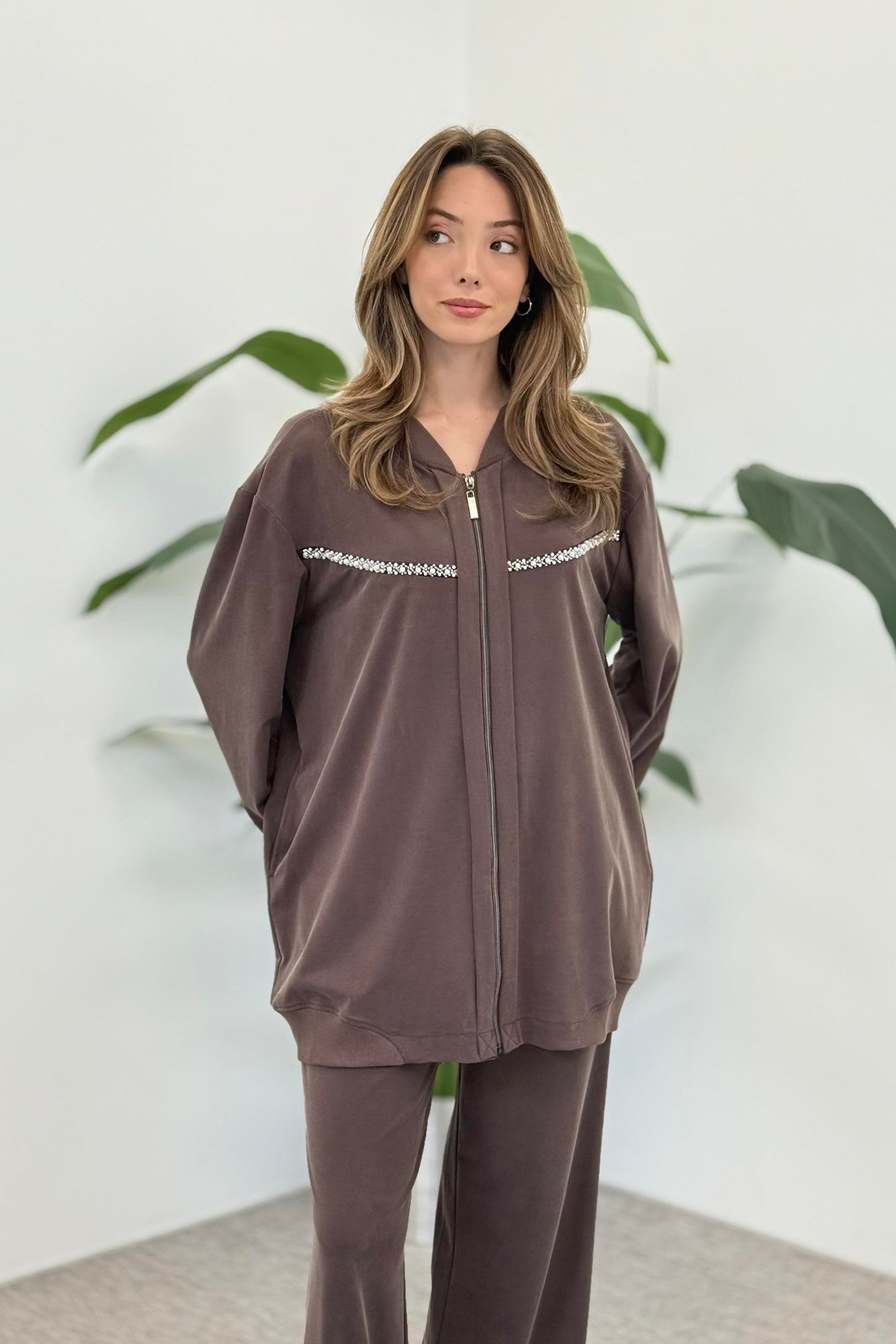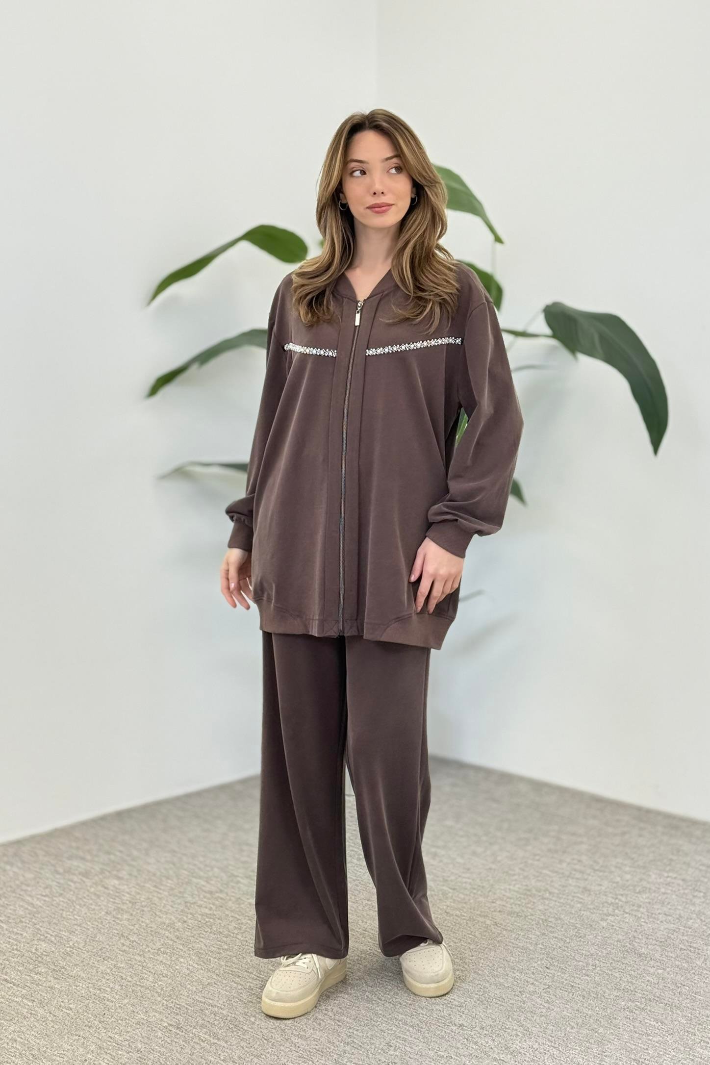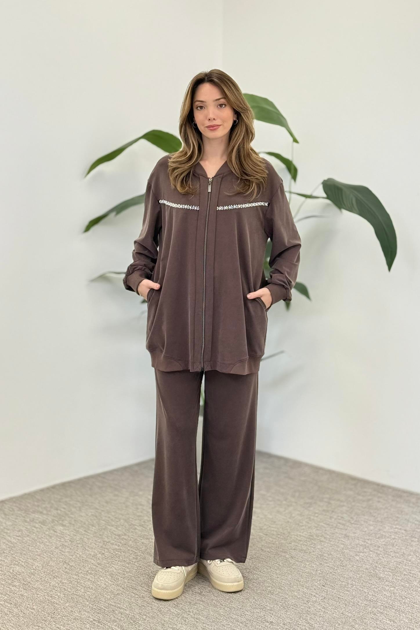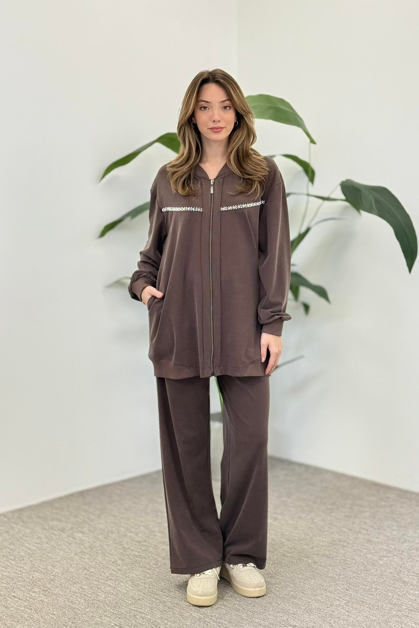 Micca 252834M Boncuk ve Taş İşlemeli Pantolonlu Takım - Kahve