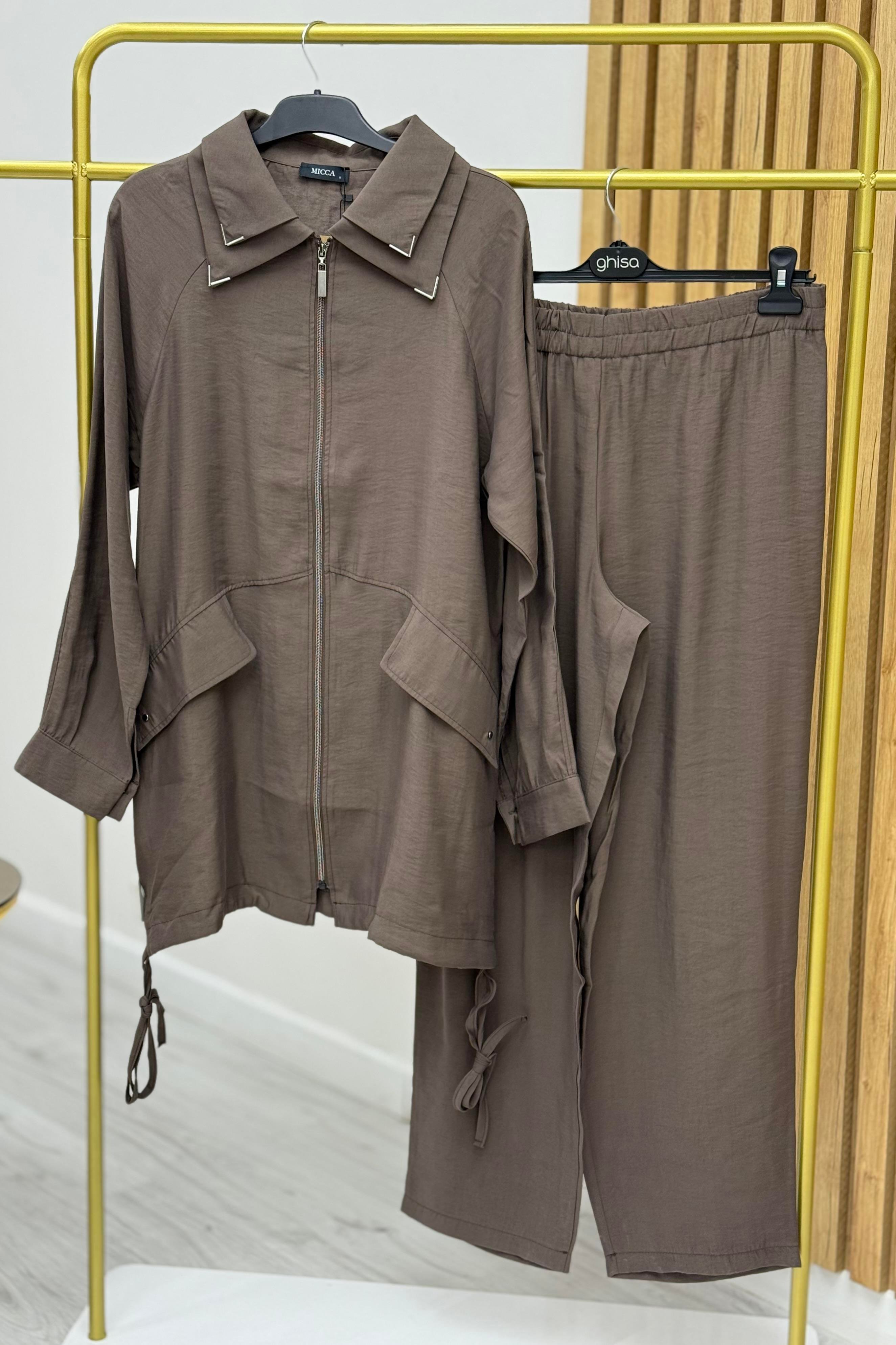 Micca 252841M Yaka V Boncuk Detay Pantolonlu Takım - Kahve