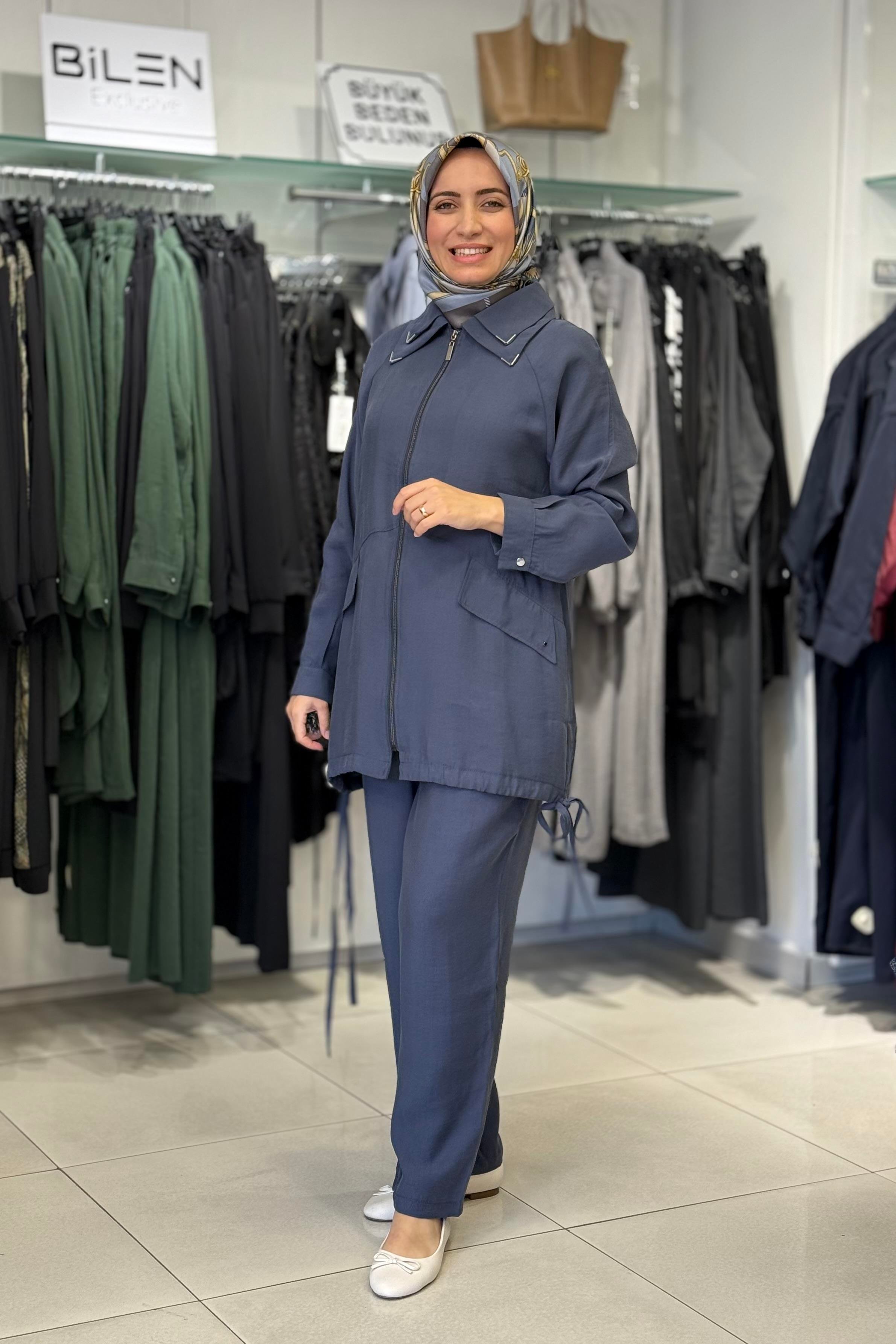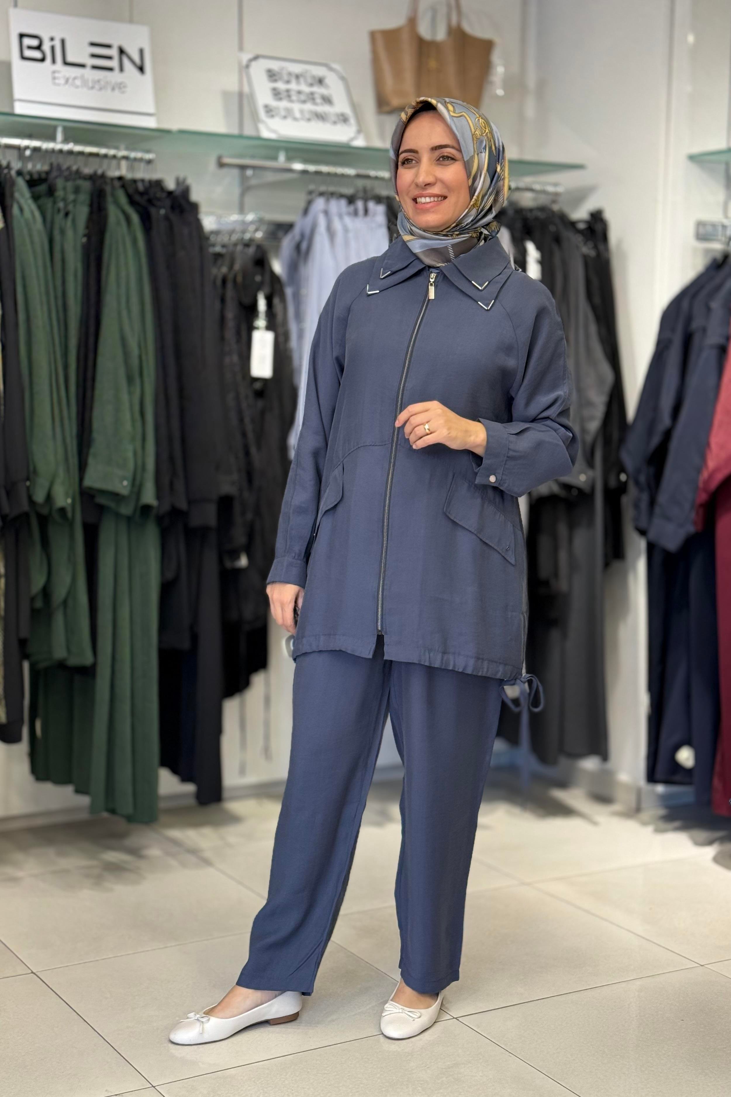 Micca 252841M Yaka V Boncuk Detay Pantolonlu Takım - Lacivert (350103908)